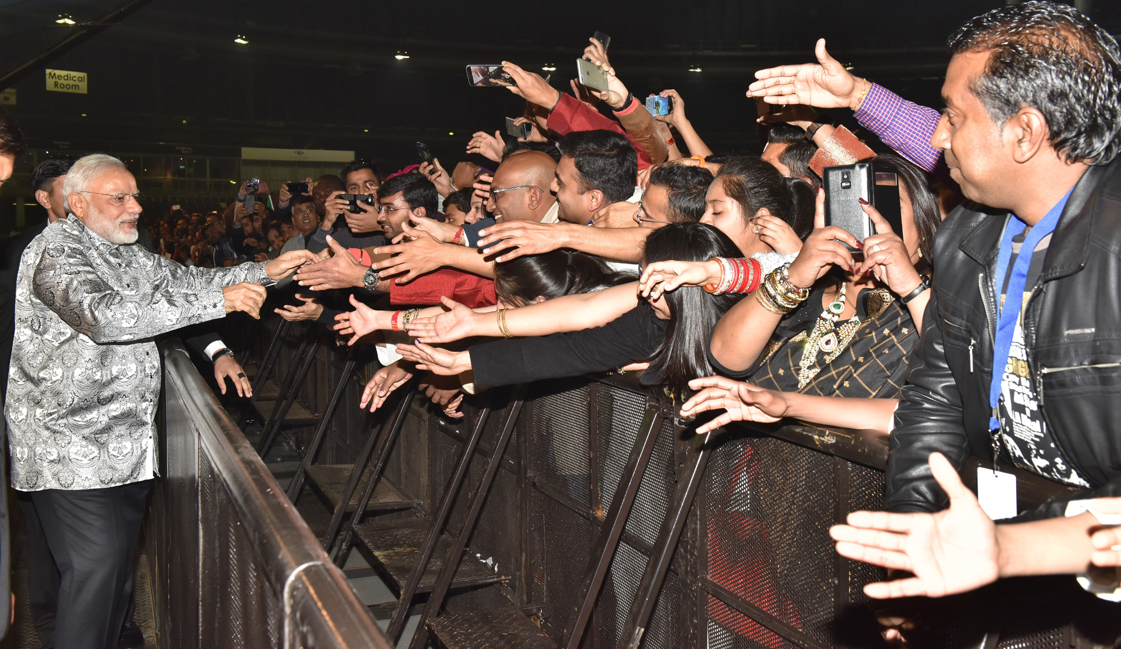 인도 총리 나렌드라 모디가 2016년 7월 8일 요하네스버그에서 인도계 커뮤니티 회원들을 만나는 모습