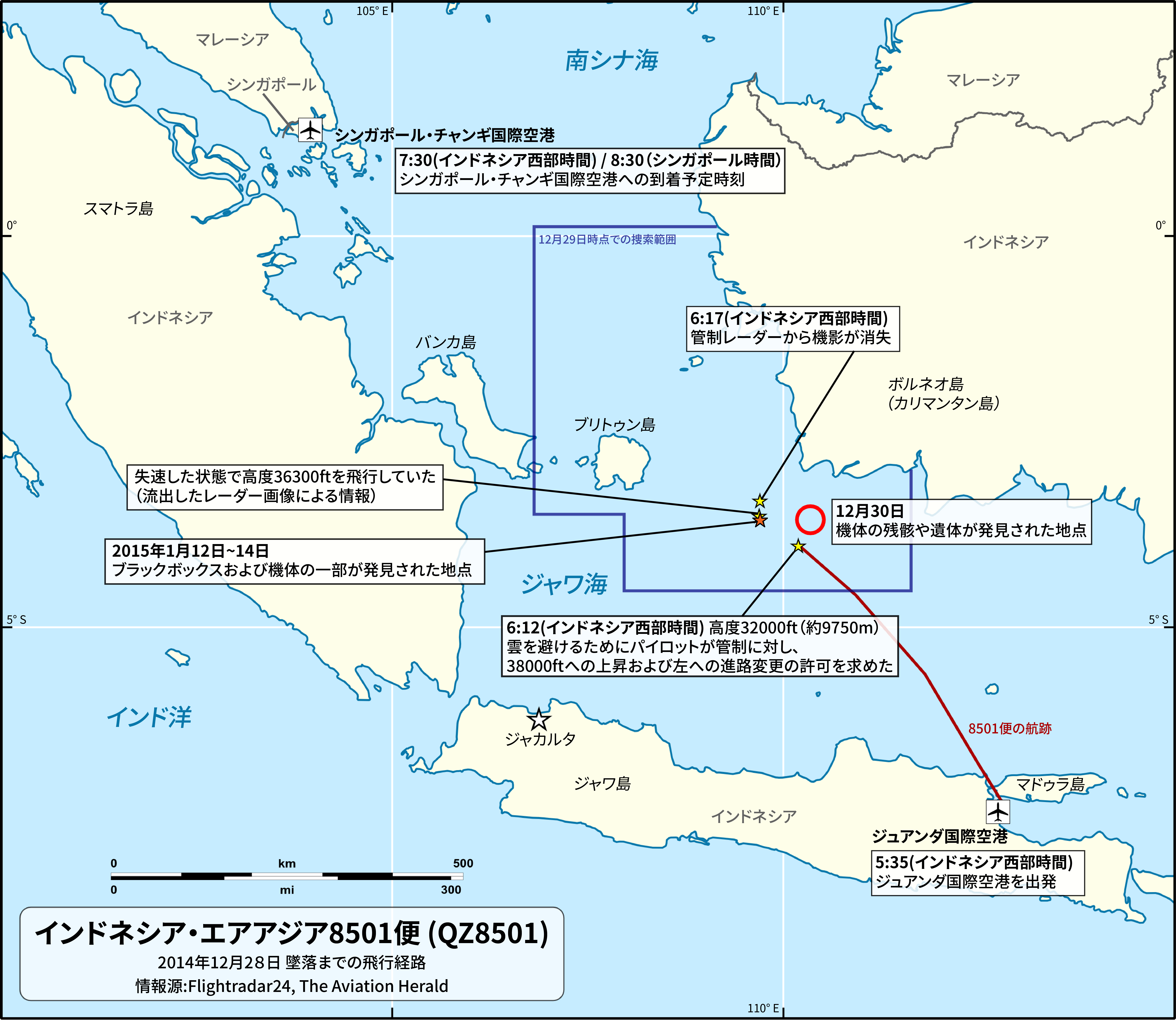 마지막으로 기록된 위치는 자바해, 카리마타 해협의 벨리퉁섬과 칼리만탄 섬 사이였다. 항공기는 벨리퉁과 보르네오섬 사이의 카리마타 해협, 자바 해에 추락했다.[12][13] 조종실 음성 녹음기는 비행 마지막 몇 분 동안 조종실에서 울리는 실속 경고를 포함한 여러 경고를 포착했다.[14] 항공기에서 조난 신호는 전송되지 않았다.[15][16] 수색 및 구조(SAR) 작전은 인도네시아 국가 수색 및 구조국(Basarnas)에 의해 팡칼 피낭 사무소에서 시작되었다.[17][18]