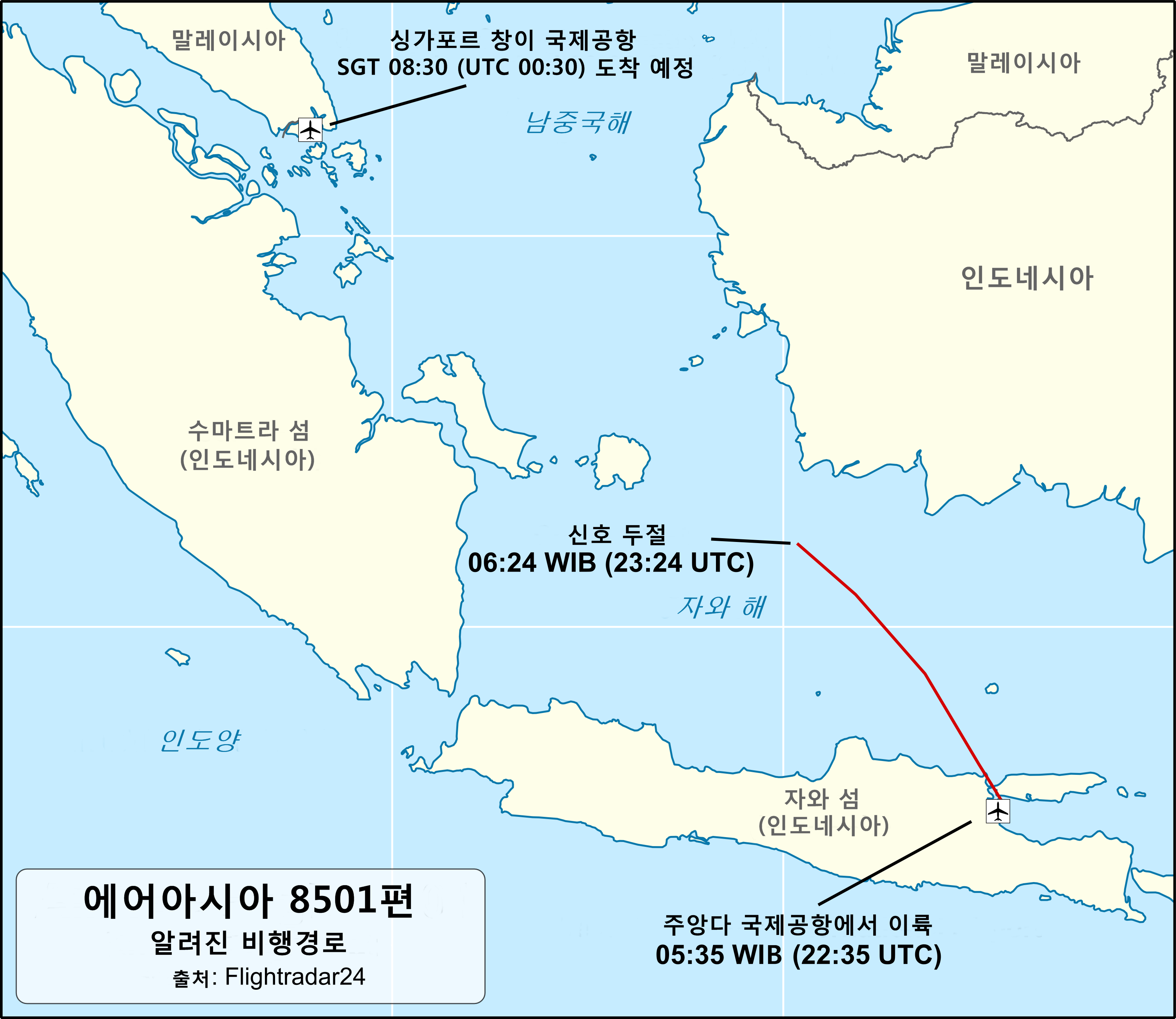 인도네시아 에어아시아 8501편은 2014년 12월 28일, 인도네시아수라바야에서 싱가포르로 가는 정기 항공편이었다.[4] 8501편은 주안다 국제공항에서 현지 시간 기준 05:35(UTC+7)에 이륙하여, 싱가포르 표준시 기준 08:30(UTC+8)에 싱가포르 창이 국제공항에 착륙할 예정이었다.[243]
