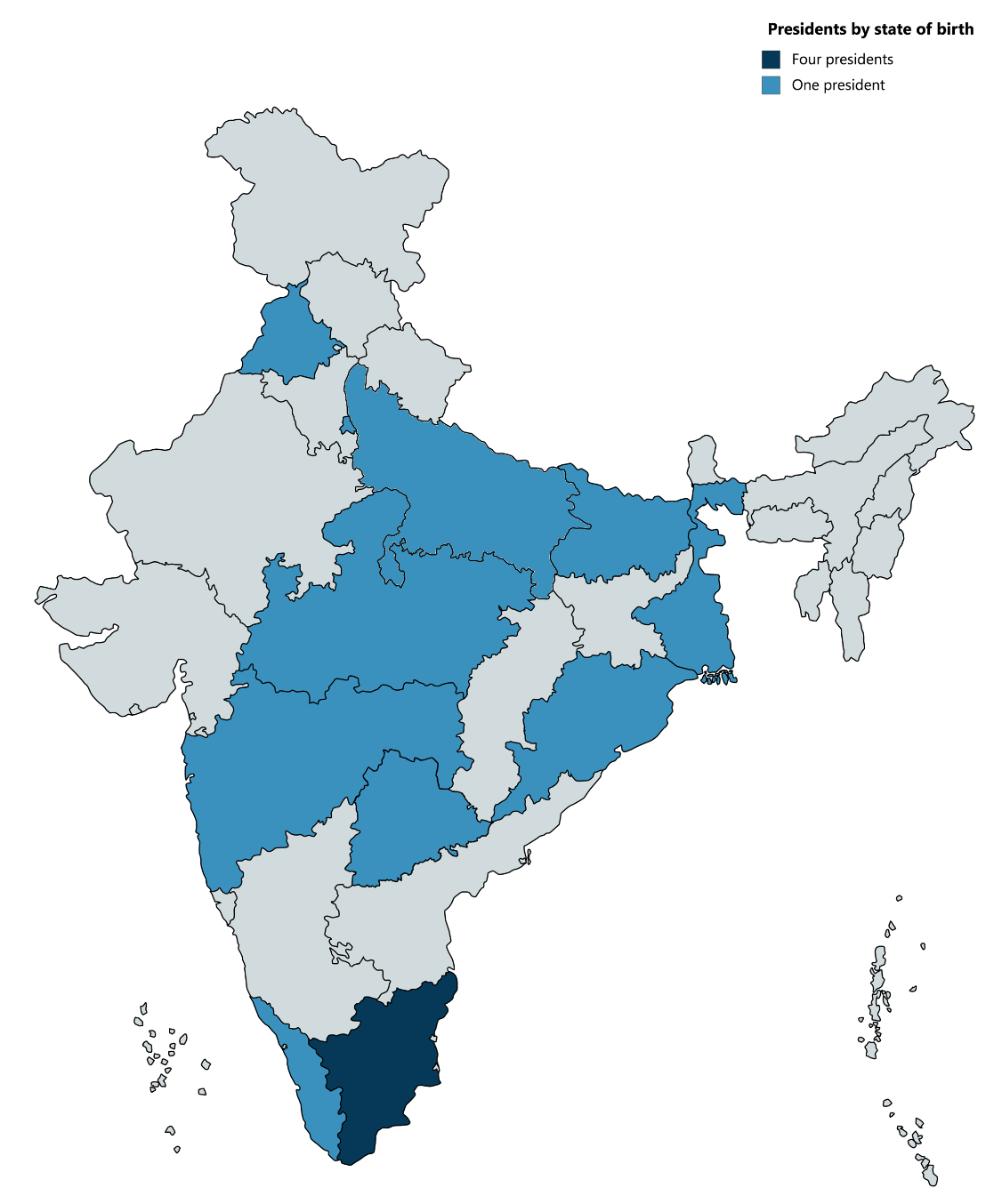 4명의 대통령을 배출한 주(진한 파란색)와 1명의 대통령을 배출한 주(연한 파란색)