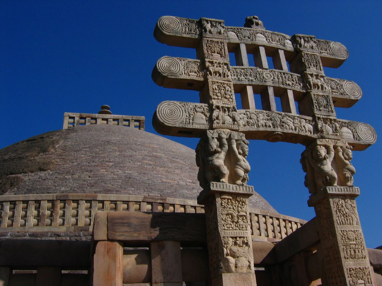 산치의 불교 기념물군은 현존하는 가장 오래된 불교 성지 중 하나이며, 인도 아대륙 전역으로 종교를 확산시키는 데 중요한 역할을 했다. 기원전 3세기에 마우리아 제국의 아쇼카 황제 시대에 중요해졌다. 이 시대의 아쇼카 석주 유적이 보존되어 있다. 스투파, 궁전, 사원, 그리고 수도원은 다양한 보존 상태로 보존되어 있으며, 대부분 기원전 2세기와 1세기에 제작되었다. 이 도시는 12세기에 중요성이 쇠퇴했다.[30]