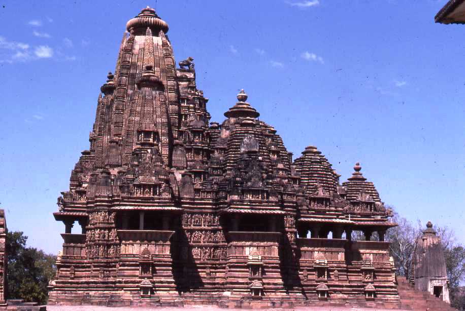 카주라호 기념물군은 찬델라 왕조 시대인 10세기와 11세기에 건설된 23개의 사원, 즉 힌두교와 자이나교 사원으로 구성되어 있다. 이 사원은 힌두 사원 건축의 나가라 양식으로 건설되었다. 이들은 신성하고 세속적인 모티프, 즉 가정생활, 음악가, 무용수, 그리고 애정 넘치는 커플의 묘사를 포함한 돌 조각과 조각으로 풍부하게 장식되어 있다.[19]