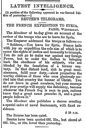 1860년 프랑스의 시리아 원정은 1860년 드루즈-마로니트 갈등 이후 평화를 회복하기 위해 프랑스 주도의 다국적군이 레바논에 파병된 사건이다. 국제적 비난이 쏟아지자 오스만 제국은 1860년 8월 3일 질서를 재정립하기 위해 최대 1만 2천 명의 유럽 군인 파병에 동의했다.[17]