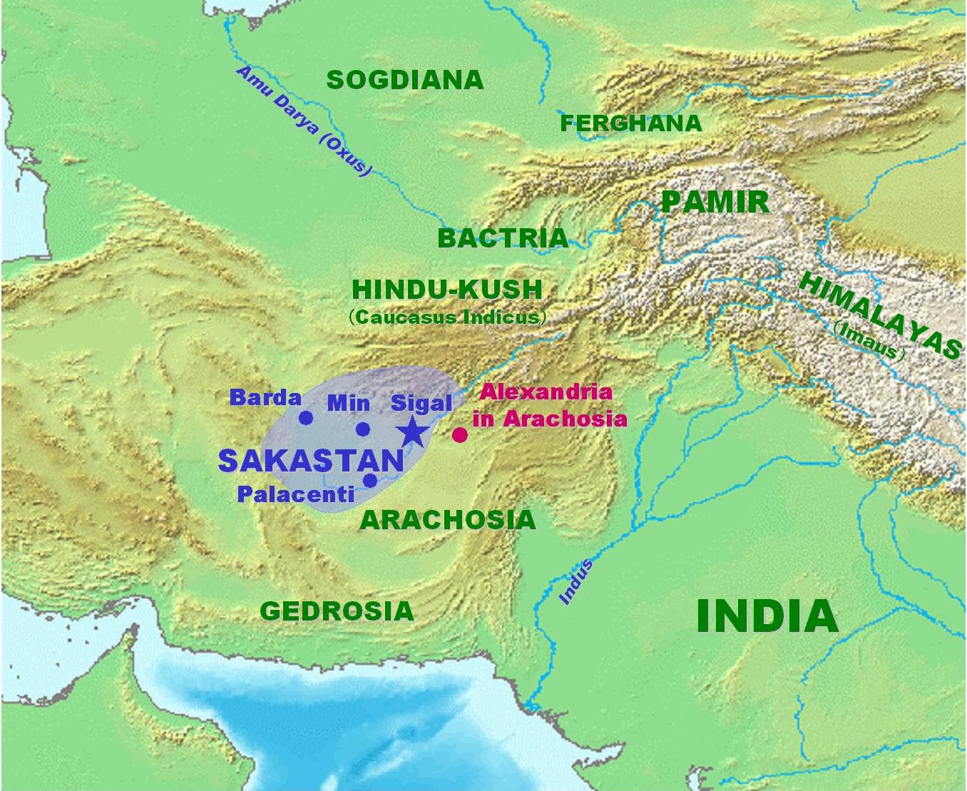 사카족은 남부 아프가니스탄, 서부 파키스탄, 그리고 남부 이란 지역인 드랑기아나에 정착했고, 그 지역은 그들의 이름을 따서 사카스탄 또는 시스탄이라고 불렸다.[108] 아르사크 황제 미트리다테스 2세는 중앙아시아에서 공격적인 군사 정책을 추구하여 파르티아 제국에 많은 지역을 추가했는데,[109] 여기에는 미트리다테스가 인도-스키타이인들로부터 빼앗은 서부 박트리아가 포함되었다.[110] 월지의 군사적 압력에 따라 인도-스키타이인들의 일부는 박트리아에서 하문호로 이주했고,[111] 기원전 1세기 말에 "스카이시안 사카이의 사키스타나"[112]라고 불리게 된 드랑기아나(시갈)에 정착했다. 기원전 1세기에 카락스의 이시도르는 사카스탄에 사카족이 존재했다는 것을 《파르티아의 역》에서 언급했다.[36]