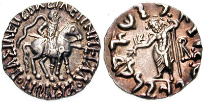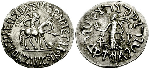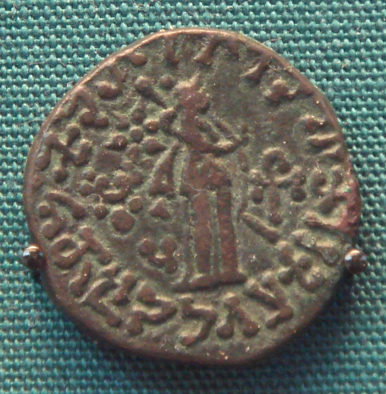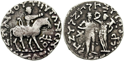 - 카라호스테스(기원전 10년 – 서기 10년): 불교 마투라 사자 기둥과 유물함에 언급되어 있다.[50][51] 그의 동전은 대영 박물관에 소장된 초기 부처 이미지가 있는 금 유물함인 비마란 유물함에서도 발견되었다. 그의 일부 동전에는 삼보 문양이 있다.
