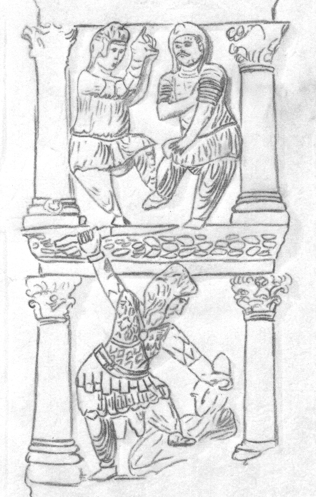간다라 미술에서 군복을 착용한 인도-스키타이 병사들은 때때로 불교 조각상에 묘사되는데, 특히 부네르 부조에서 그러하다. 이들은 헐렁한 튜닉과 바지, 그리고 무겁고 곧은 칼을 착용하고 묘사된다. 뾰족한 후드나 스키타이 모자를 쓰고 있는데, 이는 덥수룩한 머리 위에 간단한 머리띠를 착용했던 인도-파르티아인들과 구별된다.[46] 인도-스키타이 병사들은 오른손으로 악령을 물리치기 위해 ''카라나 무드라''를 취하기도 한다. 간다라에서 이러한 부조들은 불교 탑의 기단을 장식하는 데 사용되었다. 이들은 그리스 복장을 한 사람들을 묘사한 다른 부조들과 동시대에 제작되었으며, 이는 인도-스키타이인과 인도-그리스인의 혼합을 암시한다. 또 다른 부조에서는 동일한 유형의 병사들이 악기를 연주하고 춤을 추고 있는데, 간다라 미술에서 인도-스키타이인들은 전형적으로 유쾌한 신봉자로 묘사된다.