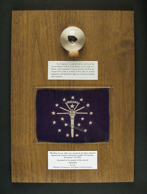 - 우주: 아폴로 11호 달 착륙 후, 주기와 0.05g의 우주 먼지가 들어 있는 전시 케이스가 NASA에 의해 제작되어 에드거 D. 휘트컴 주지사에게 선물되었다. 전시 케이스는 인디애나 주립 박물관에 전시되어 있다.[34] 1973년, 리처드 닉슨 대통령은 달 현무암 70017 조각을 인디애나주에 기증했다. 달 현무암 조각이 들어 있는 전시 케이스에는 아폴로 17호 임무 동안 우주선 아메리카에 실려 달로 운반된 주의 깃발 사본이 암석 아래에 있다.