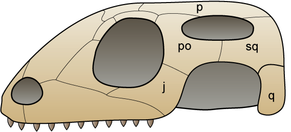 투아타라 등 일부는 관골과 사다리뼈/사다리관골 뼈 융합으로 하부 측두창을 닫는 완전한 하부 측두골을 가진 뻣뻣한 두개골을 가지는데, 이는 초기 두궁류와 유사하다. 그러나 초기 주둥이이빨류와 렙토사우로모르프는 완전한 측두골 없이 열린 하부 측두창을 가졌기에, 이는 복귀로 추정된다. 측두골은 물 때 두개골 안정에 기여한다.[31]