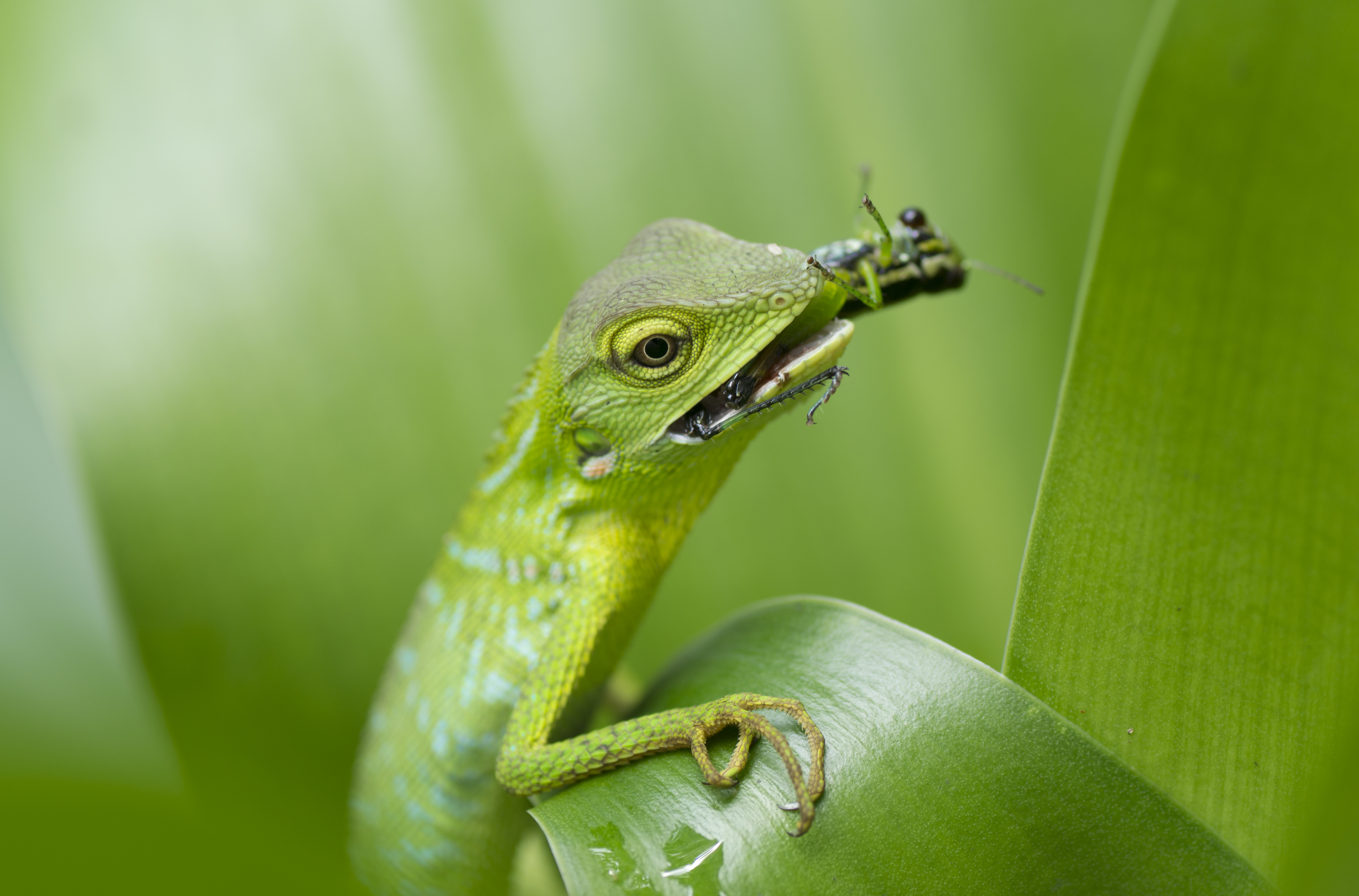- 카멜레온은 혀를 발사하여 먹이를 잡는다.[33]