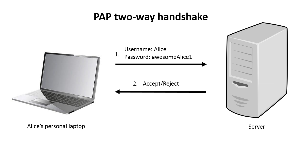 패스워드 인증 프로토콜은 가장 오래된 인증 프로토콜 중 하나이다. 인증은 클라이언트가 연결 시작 시 자격 증명(사용자 이름과 패스워드)을 담은 패킷을 전송하여 초기화되며, 승인이 수신될 때까지 클라이언트는 인증 요청을 반복한다.[6] 이 프로토콜은 자격 증명이 "평문"으로 반복적으로 전송되기 때문에 매우 안전하지 않으며, 도청 및 중간자 공격과 같은 가장 단순한 공격에도 취약하다. 널리 지원되지만, 구현 시 더 강력한 인증 방식을 제공하는 경우, PAP보다 먼저 해당 방식을 ''반드시'' 제공해야 한다고 명시되어 있다. 혼합 인증(예: 동일한 클라이언트가 PAP와 CHAP를 번갈아 사용하는 경우)도 예상되지 않는데, CHAP 인증이 PAP에 의해 평문으로 패스워드가 전송됨으로써 손상될 수 있기 때문이다.