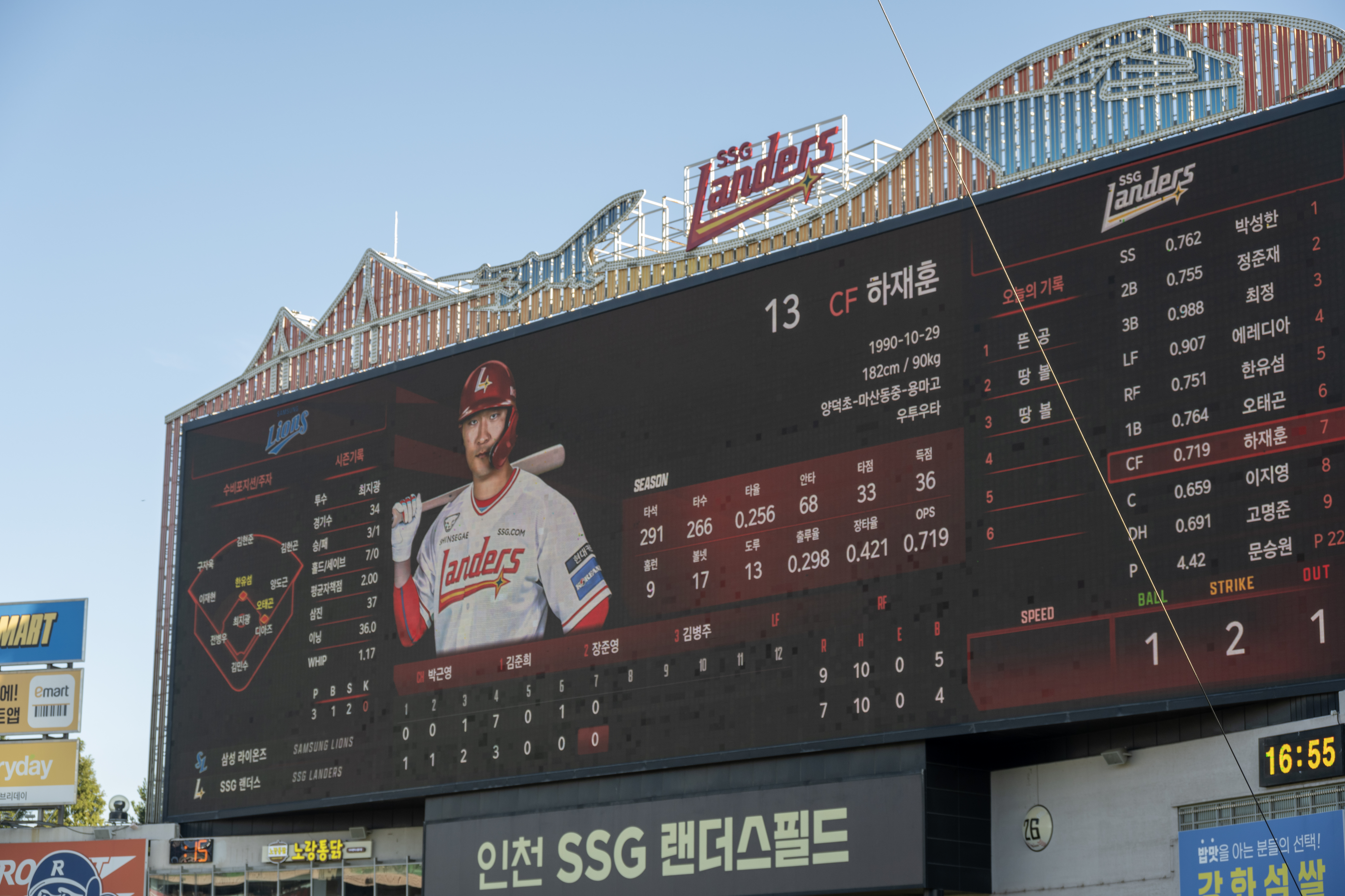 - 풀컬러 전광판: 외야 좌측에 위치. 광고, 타자 상세 정보, 응원 영상, 이벤트 동영상, 리플레이 등을 표시했다.