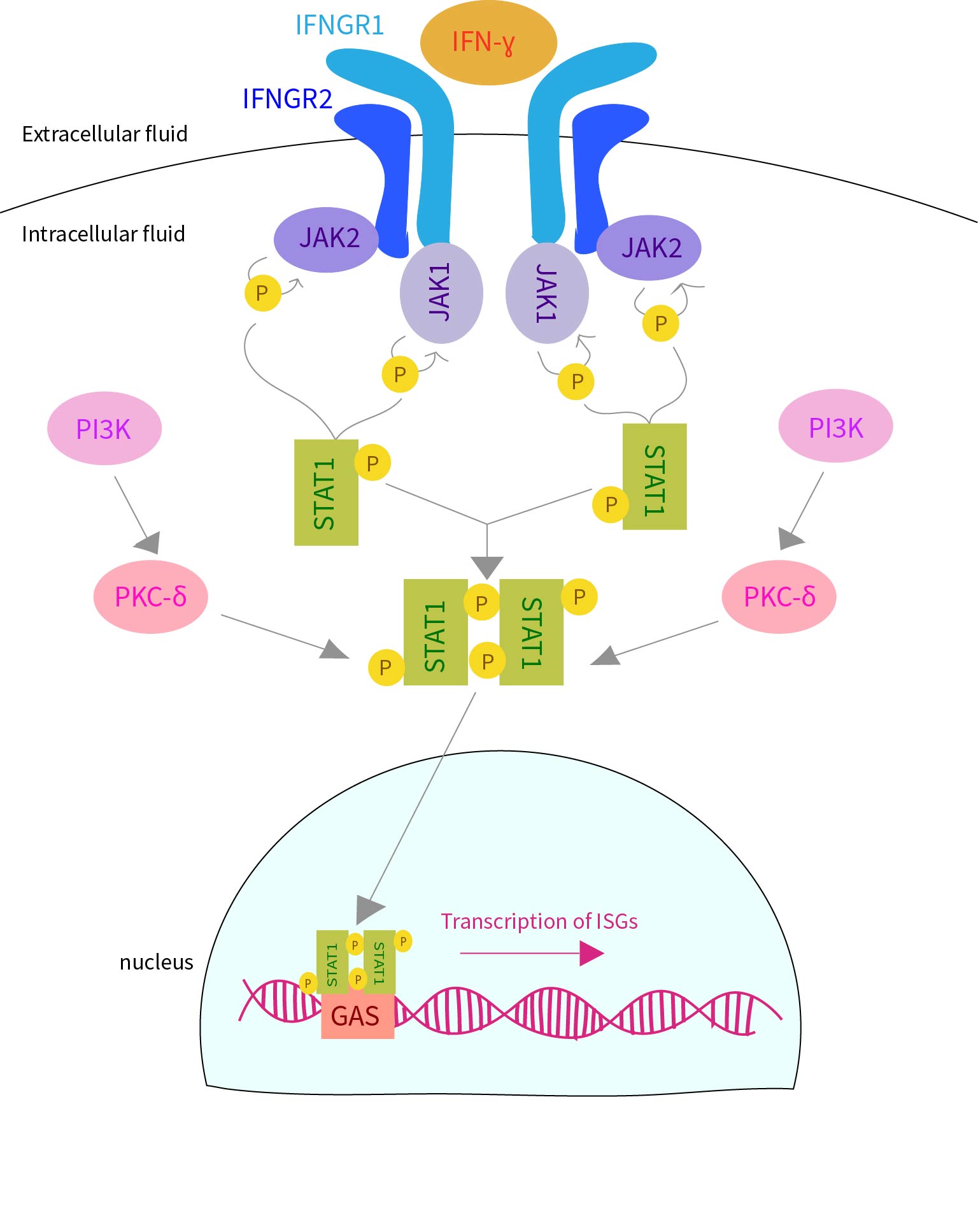 인터페론 감마(IFNG)가 IFNGR에 결합하여 유발되는 주요 경로 중 하나는 야누스 키나제 및 신호 전달자 및 전사 활성자 경로(JAK-STAT 경로)이다. JAK-STAT 경로에서 활성화된 JAK1 및 JAK2 단백질은 STAT1 전사 인자의 티로신 인산화를 조절한다. 티로신은 매우 특정한 위치에서 인산화되어 활성화된 STAT1 단백질이 서로 상호 작용하여 STAT1-STAT1 호모이합체를 형성할 수 있게 한다. 그런 다음 STAT1-STAT1 호모이합체는 세포 핵으로 들어갈 수 있다. 이들은 바이러스 억제 효과 단백질을 발현하는 인터페론 자극 유전자(ISG)의 프로모터 영역에 위치한 감마 인터페론 활성화 부위(GAS) 요소에 결합하여 전사를 시작하며, 또한 II형 IFN 신호 전달 경로의 양성 및 음성 조절 인자를 발현한다.[21]