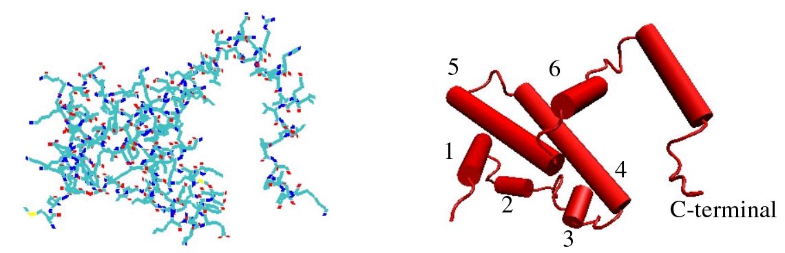 인터페론 감마 단량체는 여섯 개의 알파 나선 코어와 접히지 않고 뻗어 있는 C 말단 부위의 서열로 이루어져 있다.[139][140] 구조의 코어에 있는 알파 나선에는 1부터 6까지 번호가 매겨져 있다.