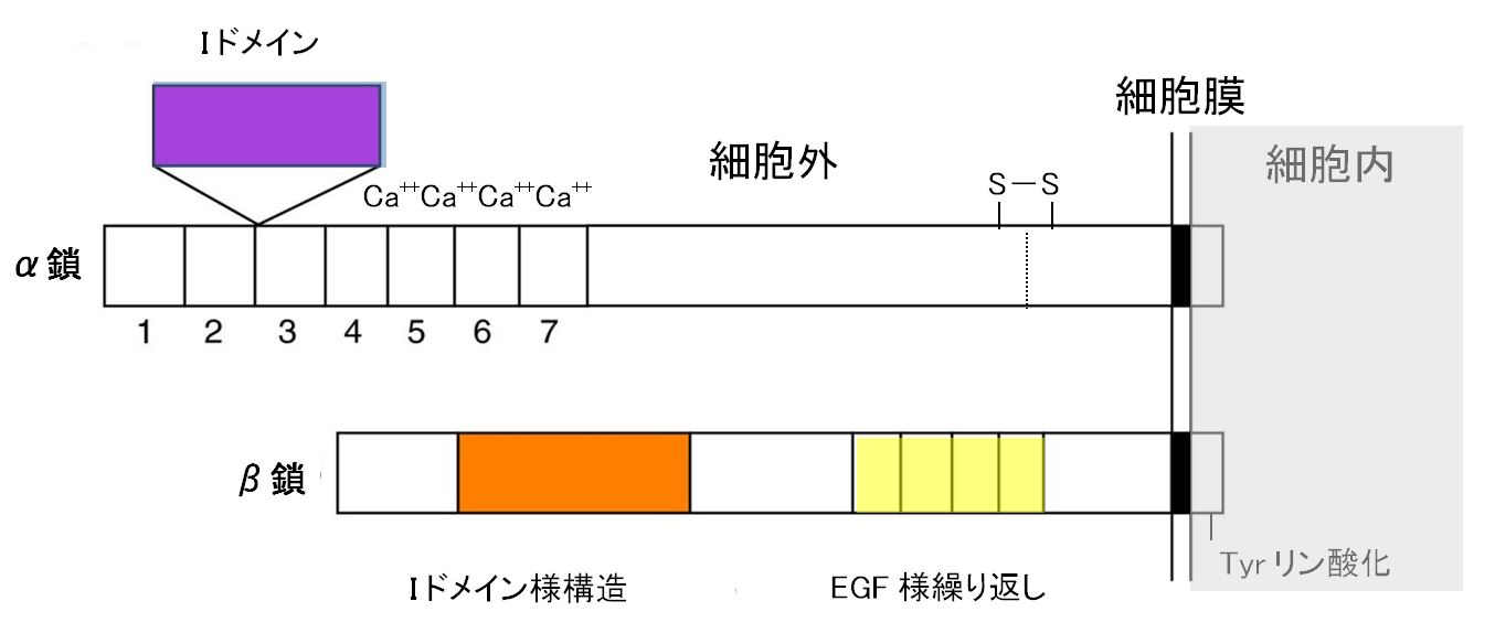 인테그린은 단백질이며, 분자로는 α 사슬과 β 사슬이 1:1로 회합하는 헤테로다이머이다.
