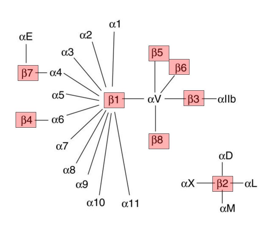 인테그린은 α와 β 단백질 소단위체가 1:1로 결합하여 만들어지는 헤테로다이머 단백질이다.