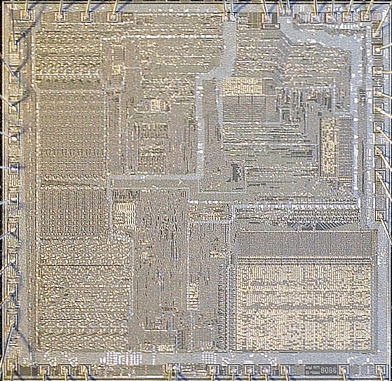 8086 아키텍처는 랜덤 로직과[13] 마이크로코드를 혼합하여 시퀀싱되었으며,[12] 약 20,000개의 활성 트랜지스터를 가진 depletion-load nMOS 회로를 사용하여 구현되었다. 이후 인텔의 새로운 정제된 nMOS 제조 공정인 HMOS(High performance MOS)로 이전되었다.[14]