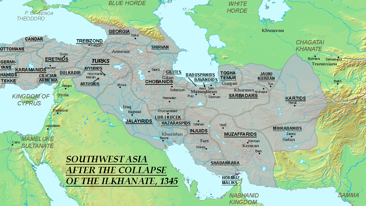 소 하산이 1343년에 암살된 후 혼란은 계속되었고, 1357년 자니 베그가 초반 왕조가 지배하던 타브리즈를 정복하면서 일 칸국의 잔존 세력은 종식되었다. 토가 테무르는 1353년에 살해당했고, 1356년 대 하산이 사망하면서 각지에서 여러 왕조가 자립했다. 1381년 시작된 티무르의 이란 원정으로 이들 왕조는 티무르 왕조에 편입되었다.