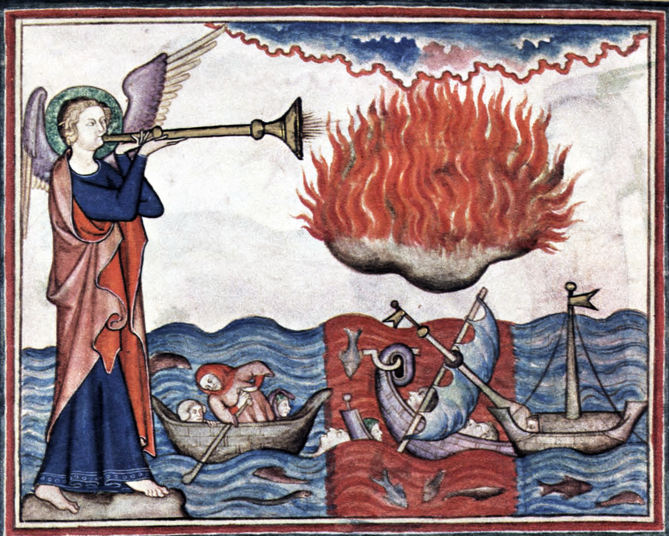 두 번째 나팔이 울리면, "불타는 큰 산"으로 묘사된 무언가가 바다에 던져져 바다의 3분의 1이 피로 변한다. 곧이어 모든 해양 생물의 3분의 1과 모든 배의 3분의 1이 파괴될 것이다.[10]