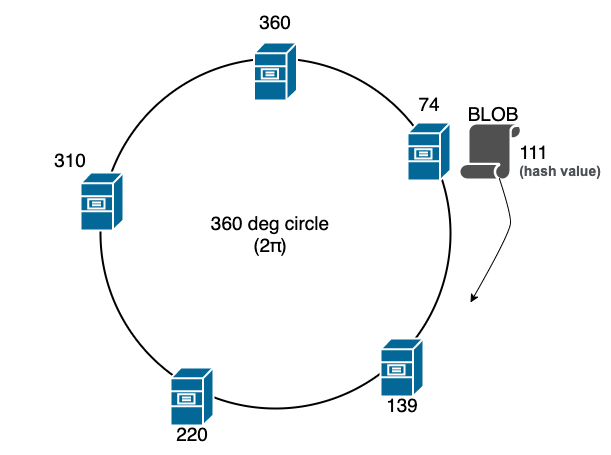 일관된 해싱은 서버가 추가되거나 제거될 때 모든 BLOB를 재할당해야 하는 문제를 피하도록 설계되었다. BLOB과 서버를 모두 단위 원(일반적으로 라디안)에 매핑하는 해시 함수를 사용한다. 예를 들어, (여기서 는 BLOB 또는 서버의 식별자, 예를 들어 IP 주소 또는 UUID)의 해시이다. 각 BLOB는 시계 방향으로 원에 나타나는 다음 서버에 할당된다. 이진 탐색 알고리즘 또는 선형 탐색을 사용하여 특정 BLOB를 배치할 "지점" 또는 서버를 찾는다. 시계 방향으로 반복하면서 (여기서 는 클러스터 내의 서버 값) 연산을 수행하여 BLOB을 배치할 서버를 찾는다. 이는 BLOB의 서버에 대한 균등한 분포를 제공한다.