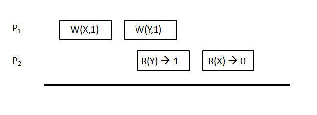 다음은 Hutto와 Ahamad의 정의에 따라 인과적 일관성을 가지는 예시이다. (W(x)2와 W(x)3이 모든 프로세스에 대해 동일한 순서로 보이지 않기 때문에 Tanenbaum et al.의 정의는 아니다.) 그러나 R(x)2와 R(x)3은 P3과 P4에서 다른 순서로 발생하므로 이 예는 순차적으로 일관되지 않는다.[7]