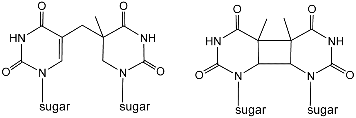 자외선이 조사되면 피부 등 세포 내 DNA를 구성하는 분자는 여기된다. 이 DNA 분자의 여기는 DNA 나선을 구성하는 "사다리"를 분리시켜 인접한 염기에 티민-티민, 시토신-시토신 등의 이량체를 형성한다. 이 이량체는 DNA 서열의 혼란, 복제의 중단, 갭 생성, 복제 실수를 발생시킨다. 이것은 암 등의 돌연변이를 일으킨다.