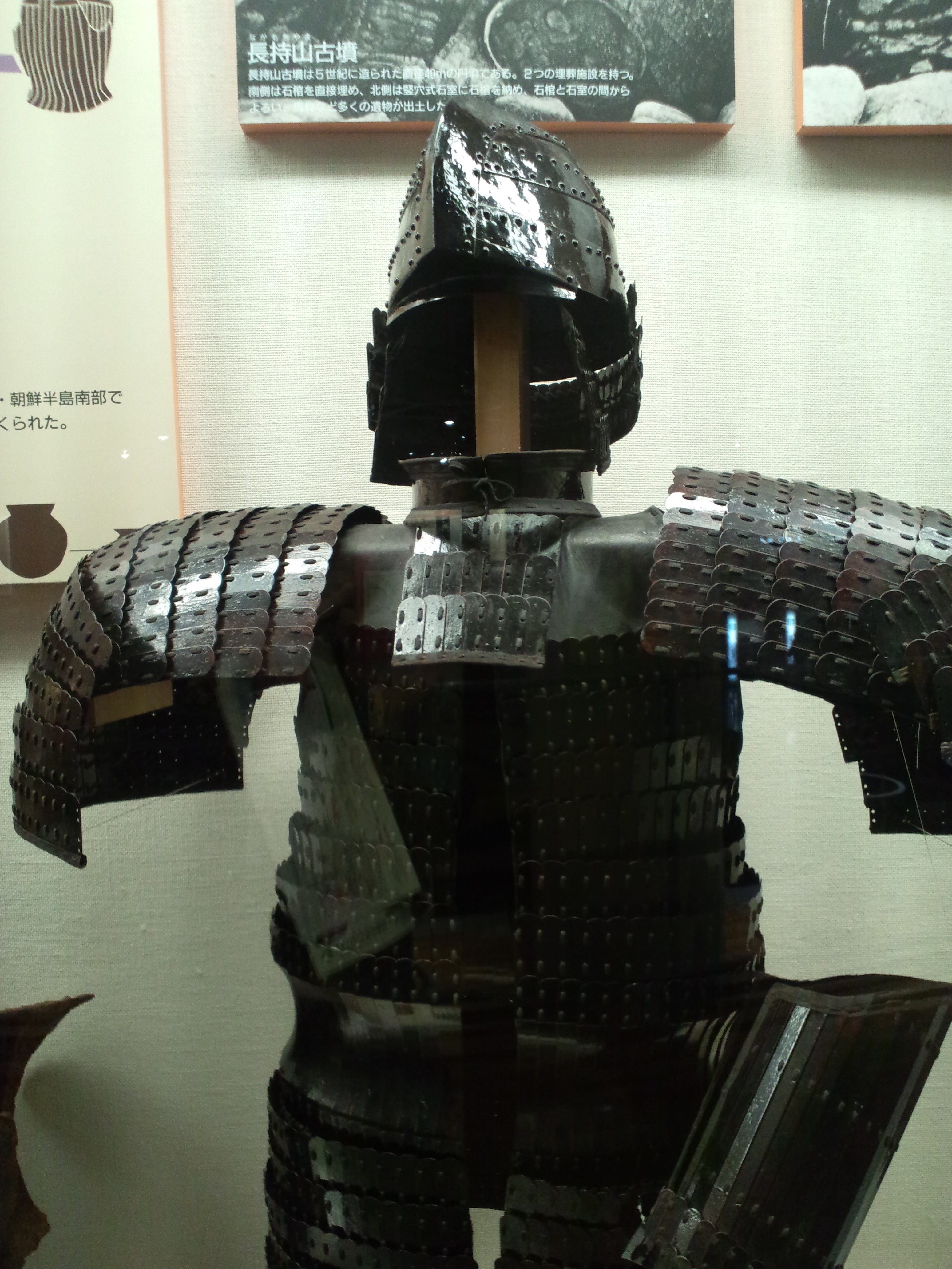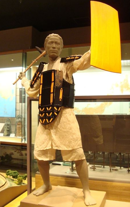 고분 시대에는 방어 무구(갑옷)로 철제 판갑(대금식 갑옷, 단갑)과 투구(충각부착투구·미피부착투구)가 등장했다. 판갑은 6세기에는 출토 유물로는 보이지 않게 되고, 기승에 적합한 소찰갑(일반적으로 개갑)으로 대체되었다. 3-4세기 유적에서는 목제 방패가 출토되어 있고, 5세기 무렵이 되면 철제 방패[207]가 등장했다. 5세기까지는 국내에서 제철도 가능하게 되고[208], 철제 칼이나 도의 생산이 증가했다. 처음에는 철광석을 채굴하여 원료로 했지만, 그 후 사철을 이용하는 일본 독자적인 방법이 생겨 안정된 국내 자급으로 이어졌다. 야요이 시대에는 일본에 말이 없었지만, 4세기 말부터 5세기 초까지는 한반도로부터의 지원에 의해 말을 도입하여 사육에 적합한 국내의 땅을 급속히 개척하고 군마 육성에 힘썼다.[209]