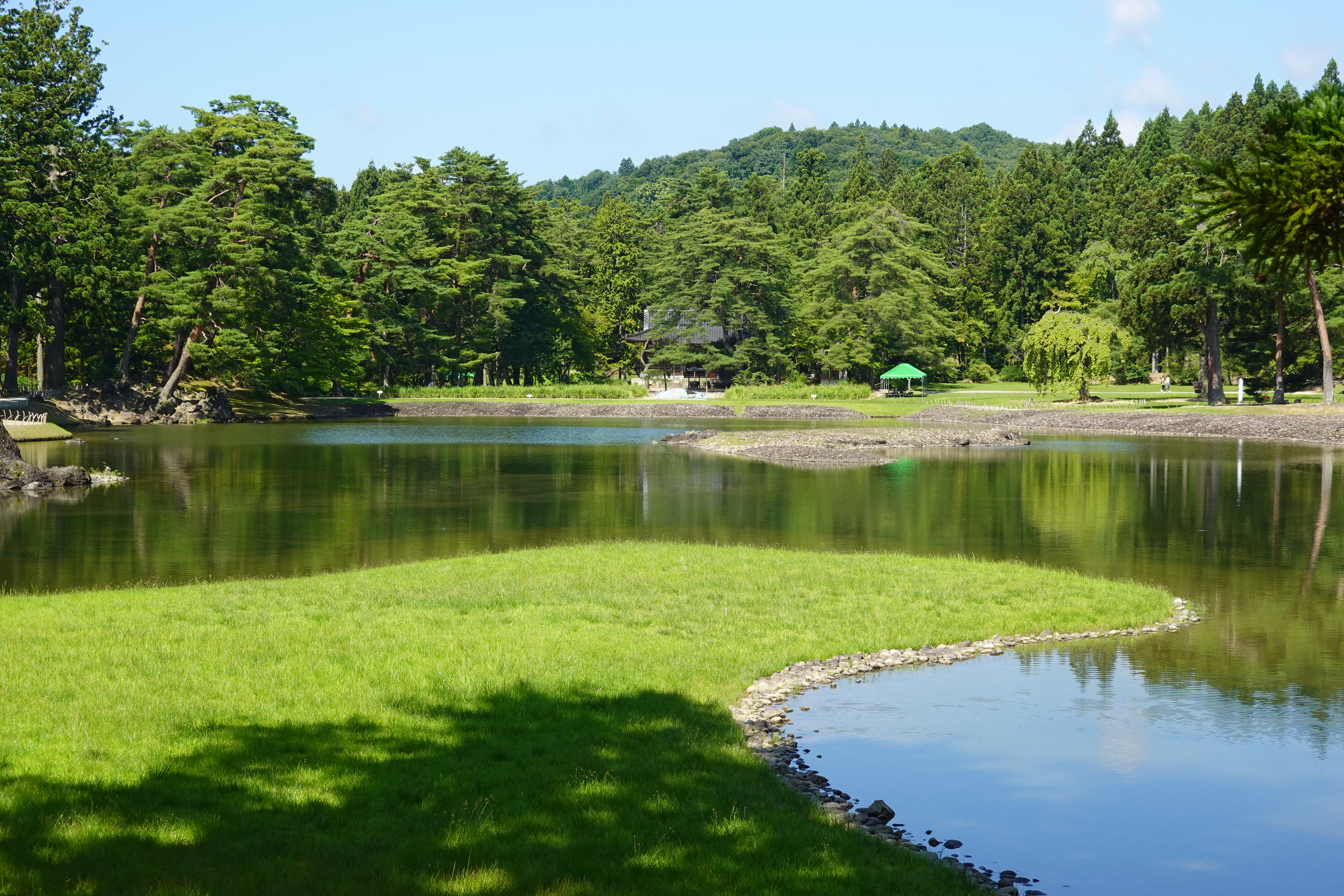 히라이즈미 - 불국토를 구현한 건축, 정원 및 고고학적 유적군은 이와테현에 위치해 있으며, 2011년 6월 유네스코 세계유산에 등재되었다.[20] 히라이즈미는 11세기와 12세기에 오슈 후지와라 가문의 행정 중심지였다.[20] 상업적, 정치적으로 교토와 경쟁 관계에 있었으나, 1189년 히라이즈미가 정치적 지위를 잃은 후 이 지역의 상당 부분이 파괴되었다.[20] 이 유적은 네 개의 정원과 킨케이산 지역으로 구성되어 있다.[20] 정원은 정토 불교의 개념에 따라 부처의 정토를 나타내도록 설계되었으며, 동시에 토착 신토 종교의 영향도 받아 일본 다른 지역의 사찰에 영향을 주었다.[20]