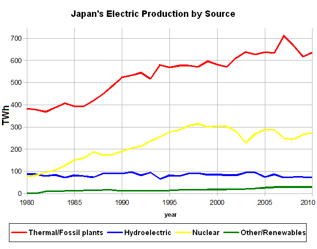 일본은 시간이 지남에 따라 원자력 발전량을 꾸준히 늘려왔다. 2003년의 하락은 2002년 TEPCO 데이터 위조 스캔들로 인한 부실한 운영 기록 때문이었다.