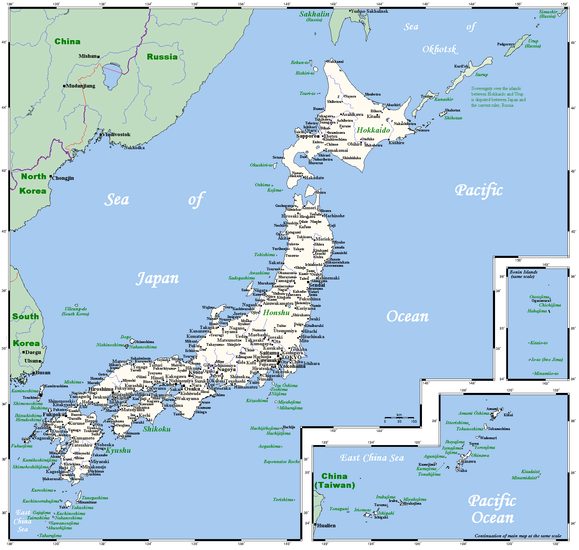 일본은 동아시아에 위치한 섬나라로, 동쪽과 남쪽은 태평양, 서쪽은 동해동중국해, 북쪽은 오호츠크해에 면해 있다.[172] 홋카이도, 혼슈, 시코쿠, 규슈의 4개 섬이 주요 섬이지만,[172][173] 이 4개 섬에 오키나와 본섬을 더한 5개 섬을 '본토'라고 칭하기도 한다.[175]