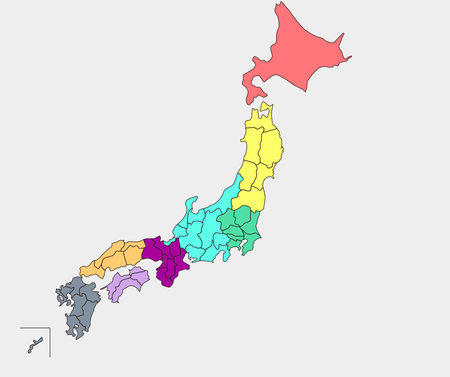 일본은 공식적으로 북동부(홋카이도)에서 남서부(류큐 열도)까지 8개의 지방으로 나뉜다.[13]