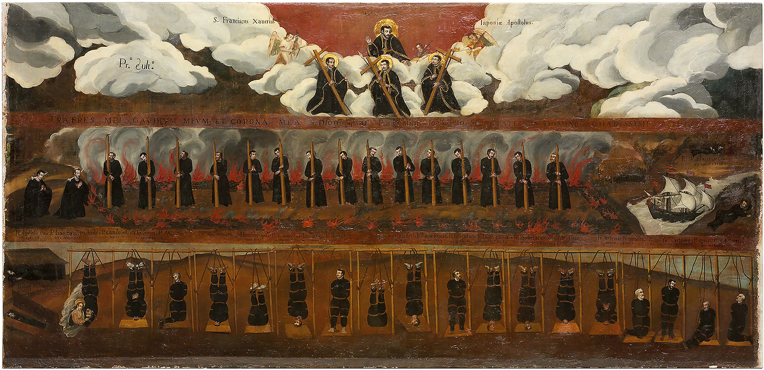 1549년 프란치스코 하비에르를 비롯한 예수회 선교사들이 일본에 도착하면서 가톨릭교회가 전파되기 시작했다. 초기에는 쇼군과 황실 정부가 이들의 활동을 지원했는데, 이는 불교 세력을 견제하고 스페인 및 포르투갈과의 무역을 증진하기 위함이었다.[1][2] 그러나 1500년대 후반에 이르러 외세의 영향과 식민주의에 대한 우려가 커지면서 통치자들은 기독교에 대한 정책을 바꾸기 시작했다.