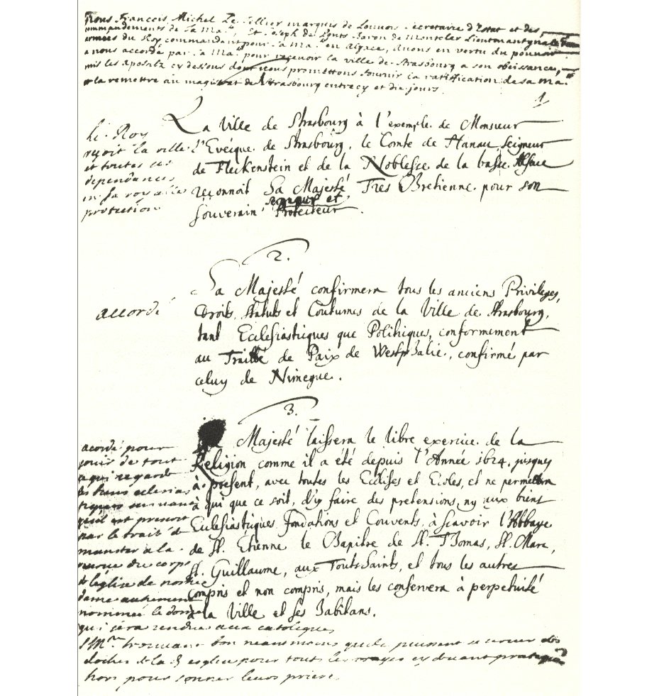 1681년, 자유 제국 도시였던 스트라스부르는 프랑스 침공에 직면하여 제국 정부의 지원을 요청했으나, 지원이 이루어지지 않아 결국 항복했다. 항복 문서는 일키르히 항복 문서(''Kapitulationsurkunde'')로 알려져 있으며, 당시 스트라스부르 시장은 한스 게오르크 폰 제들리츠였다.