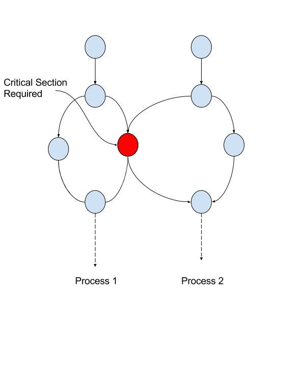 세분화된 잠금 메커니즘이 필요하지 않은 경우, 임계 구역이 중요하다. 위의 경우, A가 x의 업데이트된 값을 읽어야 하는 경우, 프로세스 A와 프로세스 B를 동시에 실행하면 원하는 결과를 얻지 못할 수 있다. 이를 방지하기 위해 변수 x는 임계 구역에 의해 보호된다. 먼저, B가 해당 구역에 접근한다. B가 값을 쓰는 것을 마치면, A가 임계 구역에 접근할 수 있으며, 변수 x를 읽을 수 있다.