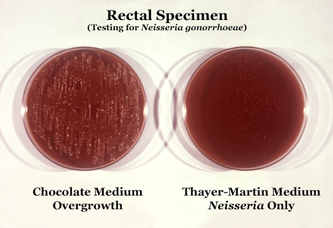 임균(''N. gonorrhoeae'')은 3-7%의 이산화탄소가 풍부한 환경에서 테이어-마틴 한천 배지(VPN) 배지에서 분리할 수 있다.[8] 테이어-마틴 한천 배지는 영양분과 항균제(반코마이신, 콜리스틴, 니스타틴, 트리메토프림)가 함유된 초콜릿 한천 배지(가열된 혈액 한천)이다. 이 한천 배지는 오염된 세균과 곰팡이의 성장을 억제하면서 ''Neisseria'' 종의 성장을 촉진한다. 마틴 루이스와 뉴욕 시티 한천 배지는 ''Neisseria'' 성장에 일반적으로 사용되는 다른 종류의 선택적 초콜릿 한천 배지이다.[8] 임균(''N. gonorrhoeae'')은 옥시다아제 양성(시토크롬 c 옥시다아제 보유)이며 카탈라아제 양성(과산화수소를 산소로 전환 가능)이다.[8] 락토스, 말토스, 수크로스, 글루코스와 같은 탄수화물과 함께 배양하면 임균(''N. gonorrhoeae'')은 글루코스만 산화시킨다.[8]