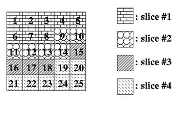 네 개의 슬라이스에 대한 매크로블록 할당 예시. 각 슬라이스는 다른 텍스처로 표시됨.