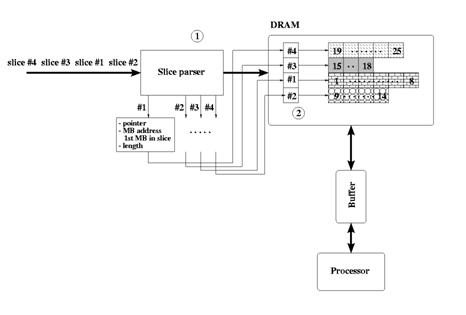 ''슬라이스'' 길이와 ''슬라이스''의 첫 번째 매크로블록(MB)의 매크로블록 주소 외에도, ''슬라이스'' 파서(그림 4)는 각 ''슬라이스''의 ''슬라이스'' 그룹(SG)을 추출해야 한다. 이 정보는 ''슬라이스'' 자체와 함께 DRAM에 저장된다. ASO와 마찬가지로, 포인터 목록(그림 4)이 생성되어야 한다.