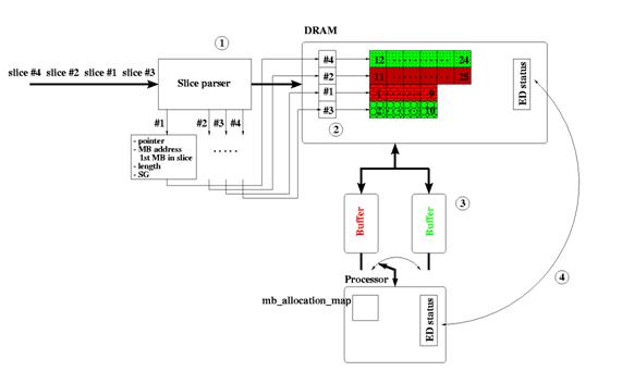 포인터 목록은 ''슬라이스''의 첫 번째 MB 주소, SG, 그리고 mb_allocation_map (프로세서의 로컬 메모리에 저장됨)과 함께 ''슬라이스''를 탐색하는 데 사용된다. ''슬라이스'' 길이는 DRAM에서 프로세서 로컬 메모리로 ''슬라이스'' 데이터를 전송하는 데 사용된다.