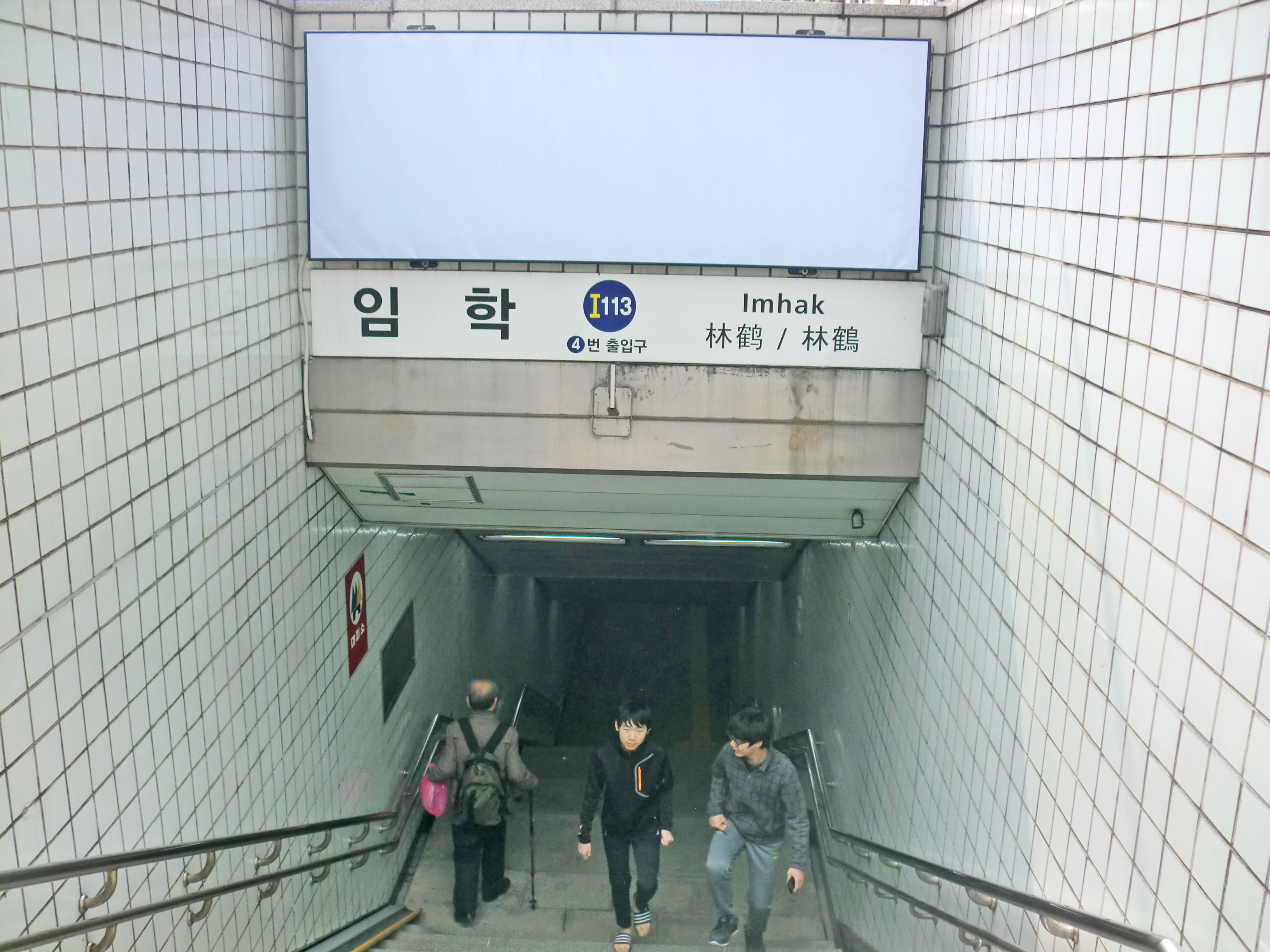 2면 2선의 상대식 승강장을 갖춘 지하역이며, 스크린도어가 설치되어 있다. 출구는 4곳이며, 1번 출구와 2번 출구 사이에 인근 상가와 연결된 통로가 있다. 직선 도로 아래에 위치하나, 인근 임학사거리 아래에 곡선 구간이 있기 때문에 완화곡선을 삽입하기 위하여 승강장이 곡선으로 건설되었으며, 승강장과 열차사이 간격이 넓으므로 주의해야 한다. 승강장의 벽면에는 특이한 형상의 그림이 있는데, 이는 학을 표현한 것이다.[1]