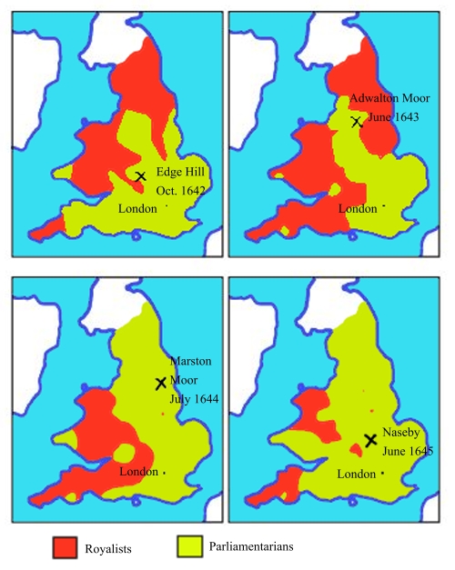 적색 - 왕당파, 녹색 - 의회파]]