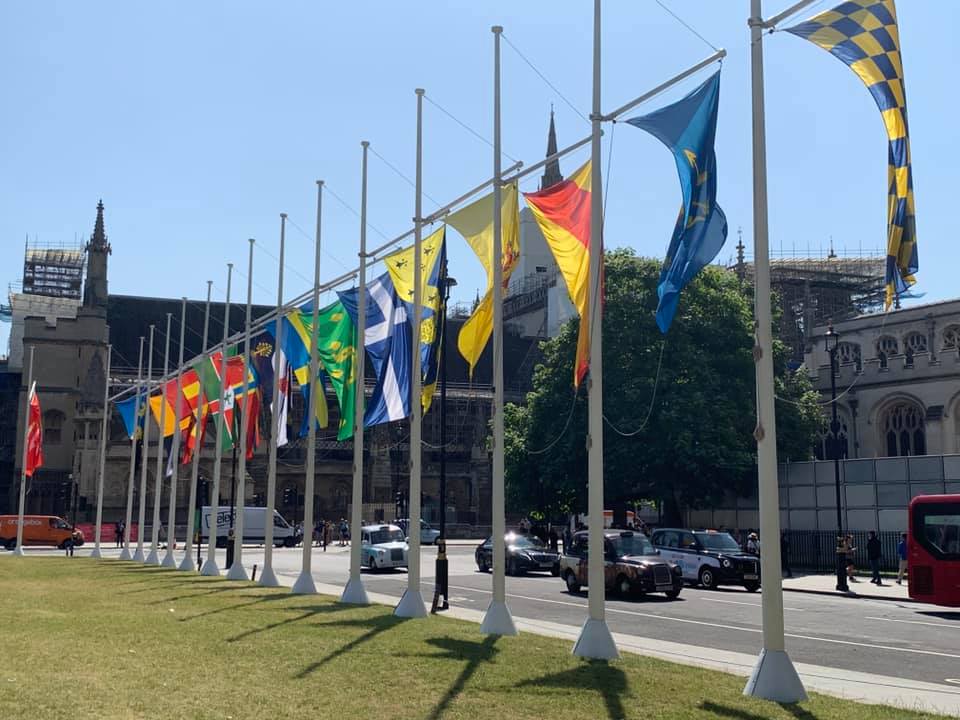 모든 카운티를 포괄하는 잘 확립된 공식 상징이나 깃발은 없다. 1889년부터 새로 창설된 카운티 의회는 문장원에 신청하여 해당 카운티와 관련된 전통적인 상징을 통합한 문장을 사용할 수 있었다. 이러한 관행은 1965년과 1974년에 새로운 카운티 의회가 창설되면서 계속되었다. 이러한 문장은 카운티 자체의 지리적 구역이 아닌 의회에 부여되었기 때문에, 일부 문장은 부여된 의회가 더 이상 존재하지 않으면 쓸모없게 되었다. 최근 일련의 깃발은 다양한 수준의 공식 채택을 거쳐 경쟁 또는 여론 조사를 통해 여러 카운티에 설립되었다. 카운티 데이는 일부 지역에서 최근에 도입되었다.[64][65]