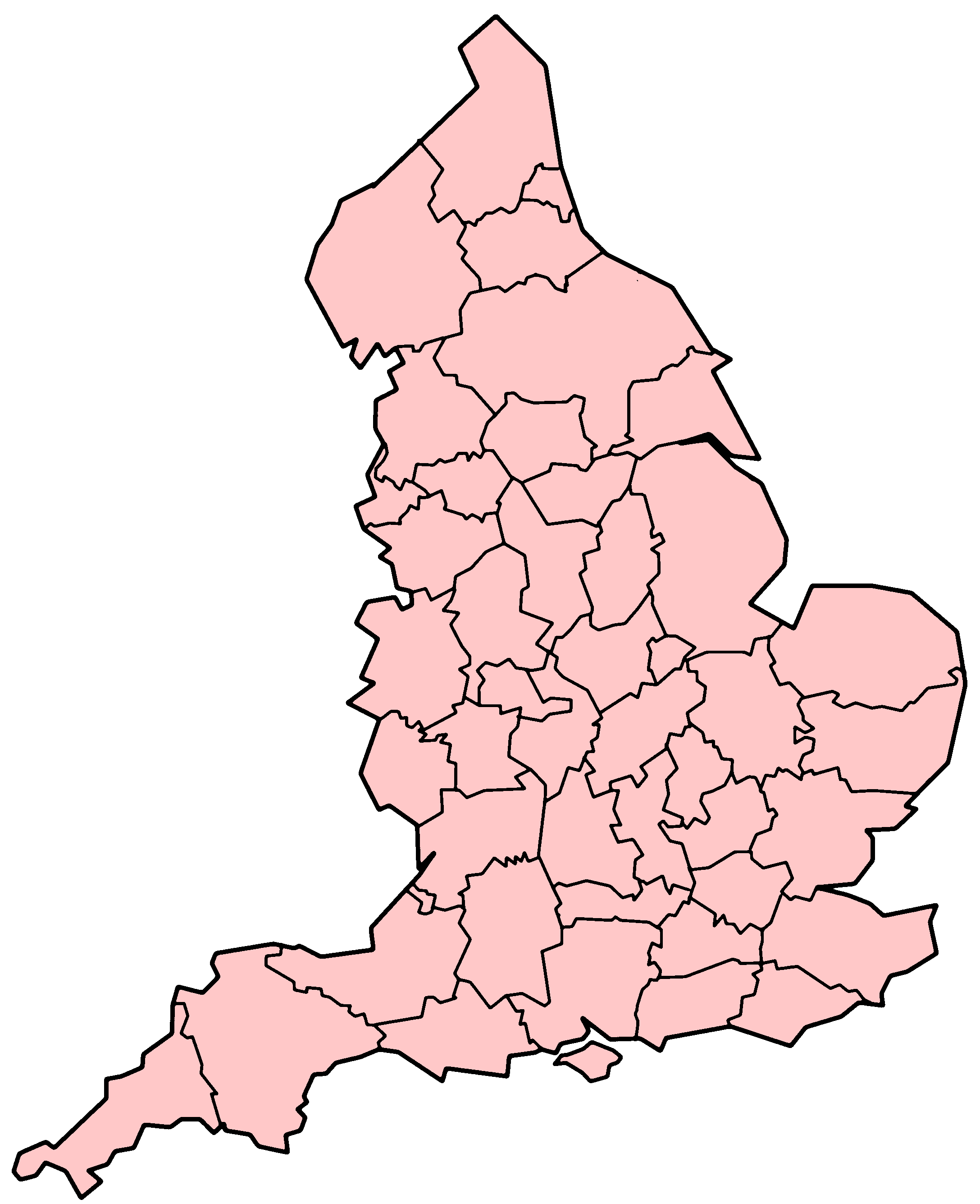 6개의 광역 카운티와 39개의 비광역 카운티는 다음과 같다.광역 카운티(Metropolitan county) 비광역 카운티(Non-metropolitan county)