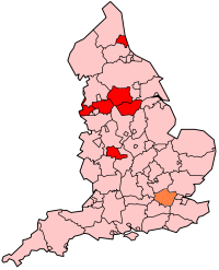그레이터맨체스터: 볼턴, 버리, 맨체스터, 올덤, 로치데일, 솔퍼드, 스톡포트, 타임사이드, 트래퍼드, 위건 |