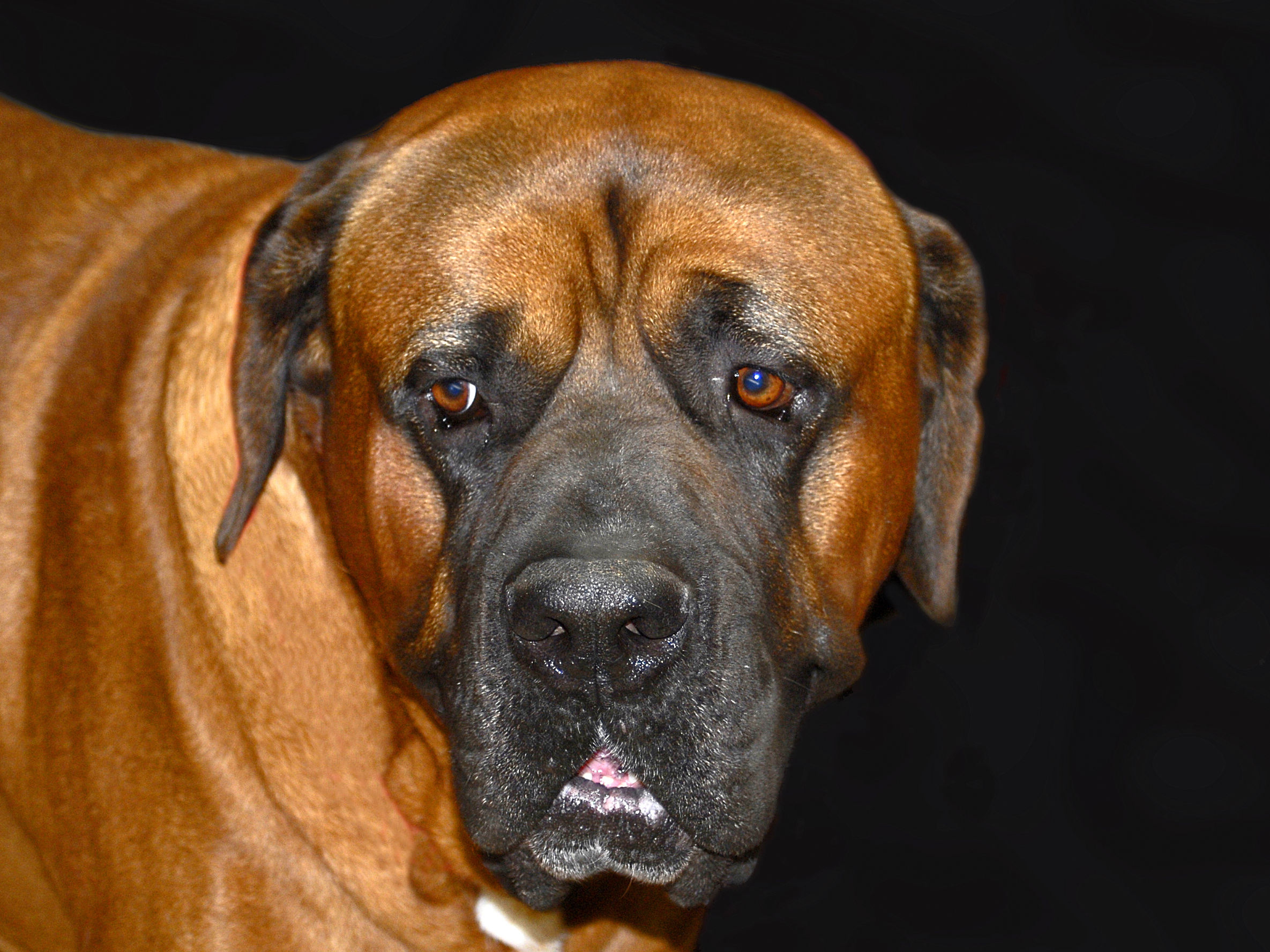 thumb과 주둥이를 가진 마스티프로, 검은색 마스크가 있는 브린들 모색이다.]]