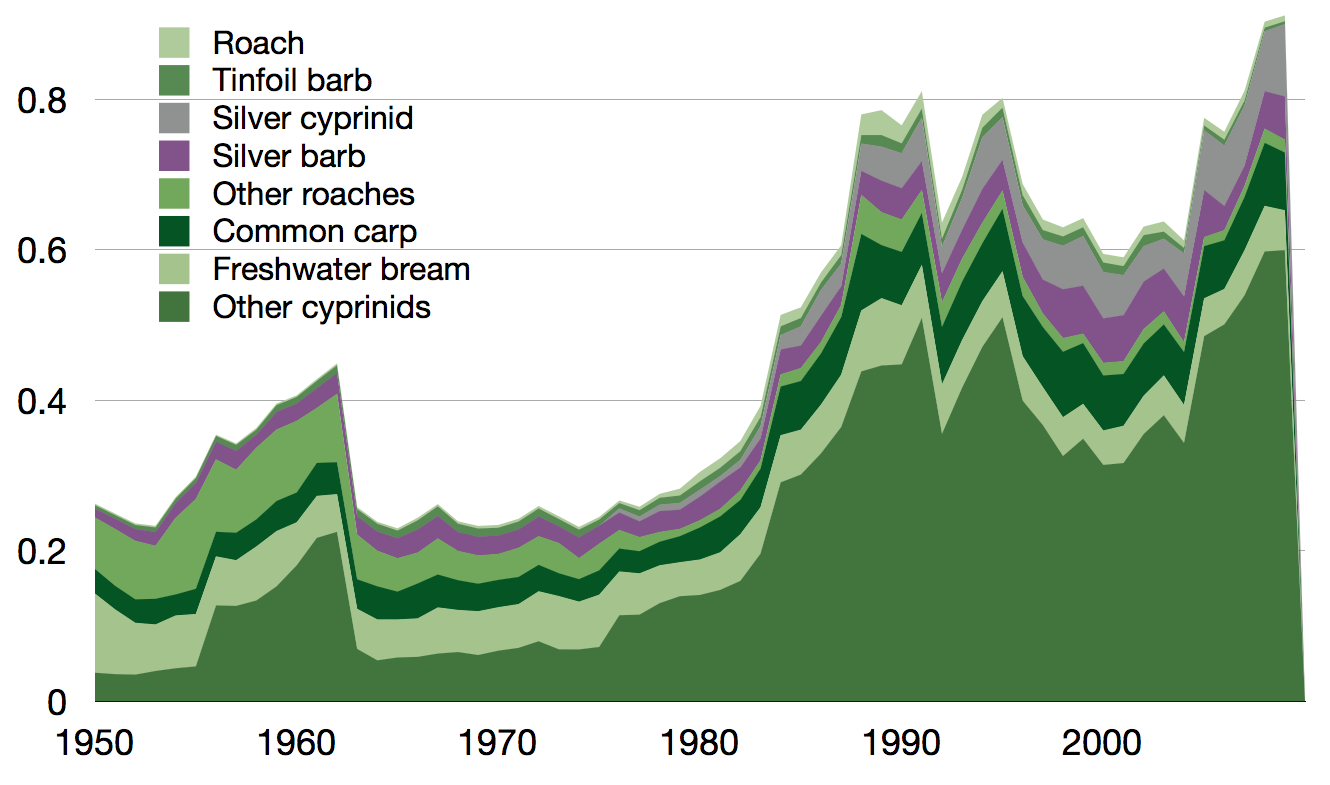 잉어(`Cyprinus carpio`)는 오스트레일리아에서 담수 환경, 편의시설 및 농업 경제에 영향을 미치는 주요 해충 종이다. 1960년대 야생에서 처음 정착했을 때 토착 어류 개체군을 격감시켜 생물 다양성을 파괴했으며, 오스트레일리아 동부의 주요 강 시스템인 머레이-달링 분지에서는 어류 생물량의 80~90%를 차지한다.[15]