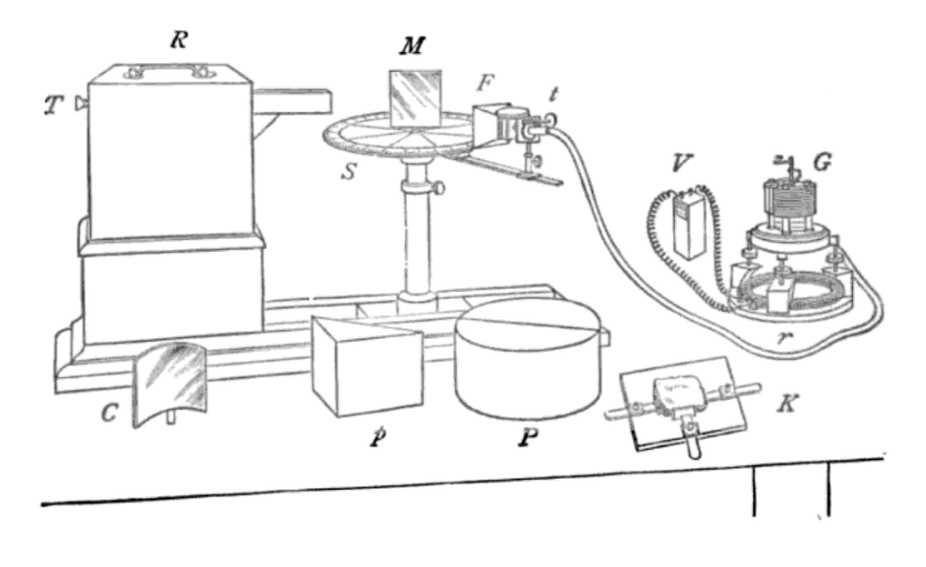 보스의 1897년 논문에 나온 마이크로파 수신기 및 송신기 장치의 다이어그램.