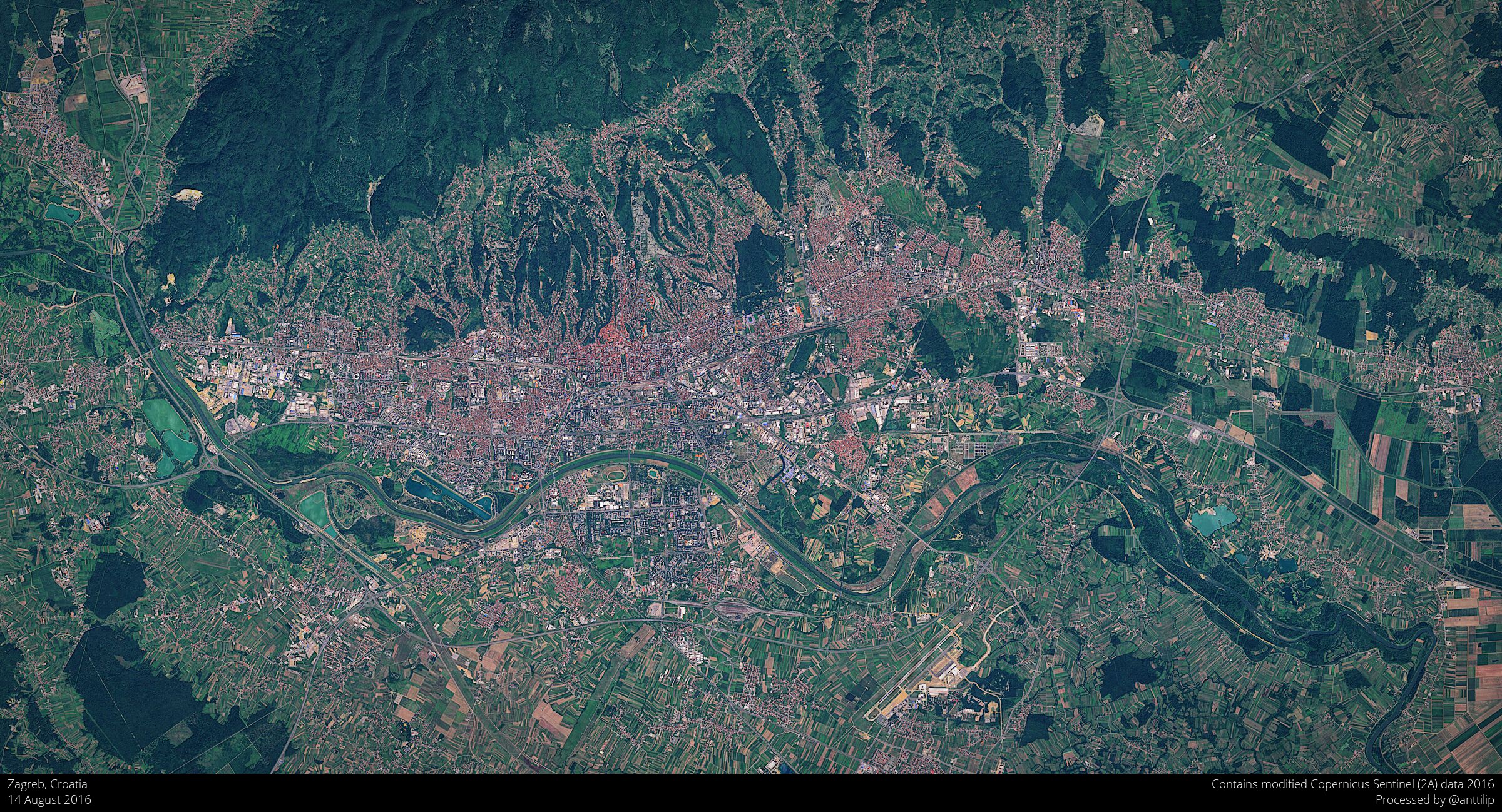 자그레브는 크로아티아 북서부에 위치하며, 메드베드니차 산( Zagrebačka gorahr ) 남쪽 기슭과 사바 강 유역에 걸쳐 자리 잡고 있다. 도시 북쪽으로는 메드베드니차 산이 솟아 있으며, 최고봉은 슬리에메(해발 1035m)이다. 남쪽으로는 사바 강과 쿠파 강 계곡이 펼쳐진다. 이 도시는 주베르크-메드베드니차 단층대와 인접해 있어 지진 활동이 활발한 지역으로 분류된다.[70][71]