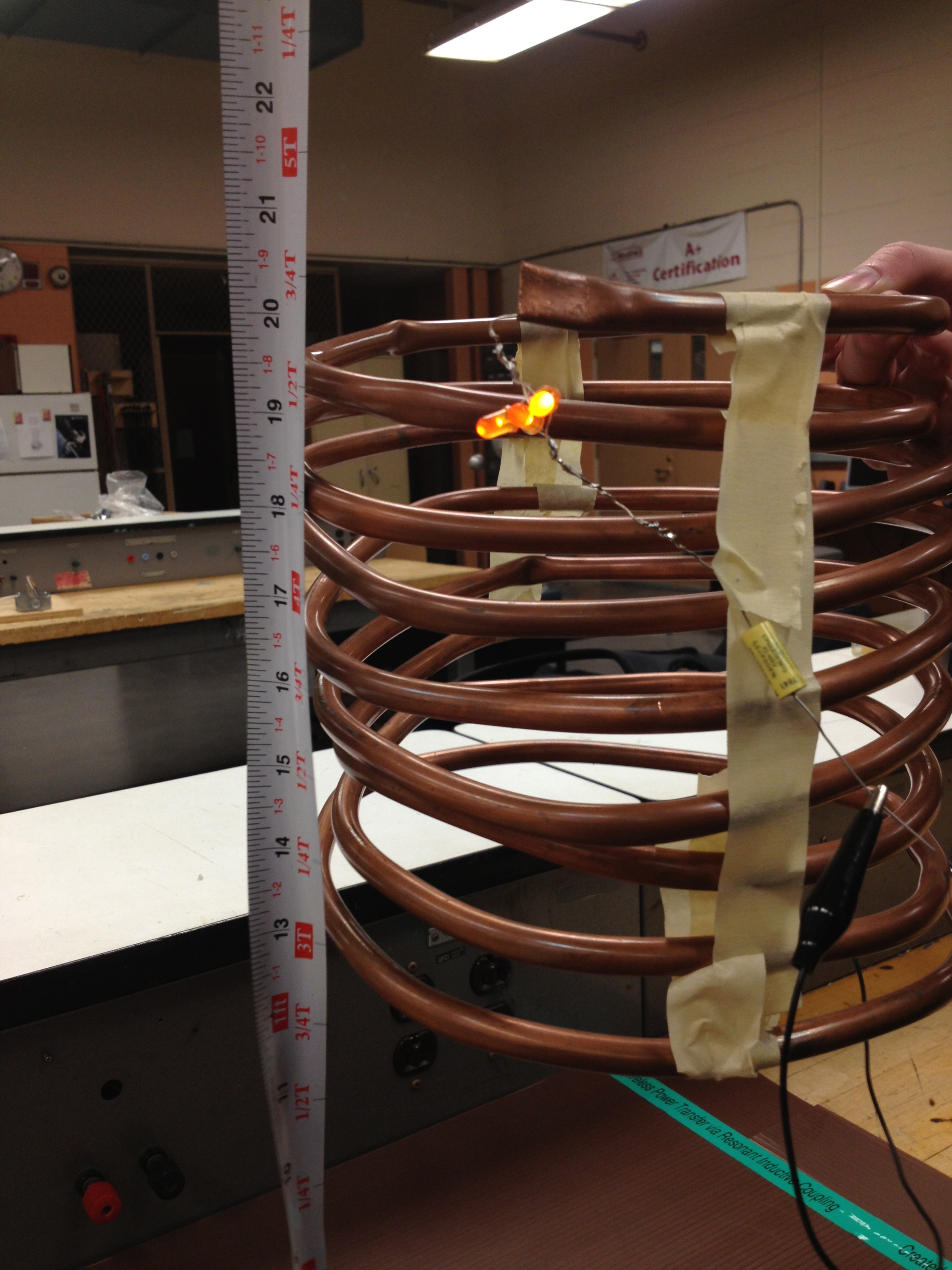 1894년, 니콜라 테슬라는 "전기역학적 유도"라고도 알려진 공진 유도 결합을 사용하여 뉴욕시의 연구소에서 인광 및 백열 전구를 무선으로 켰다.[56][57][58] 1897년 그는 고전압 공진 변압기 ("테슬라 코일")를 특허냈다.[59] 테슬라 코일은 1차 코일에서 2차 코일로 공진 유도를 통해 전기에너지를 전달하여 고전압에서 고주파의 고전압을 생성할 수 있었다. 개선된 설계는 "장치 자체의 파괴 및 이에 접근하거나 취급하는 사람에게 심각한 위험 없이" 고전위 전류를 안전하게 생산하고 사용할 수 있게 했다.