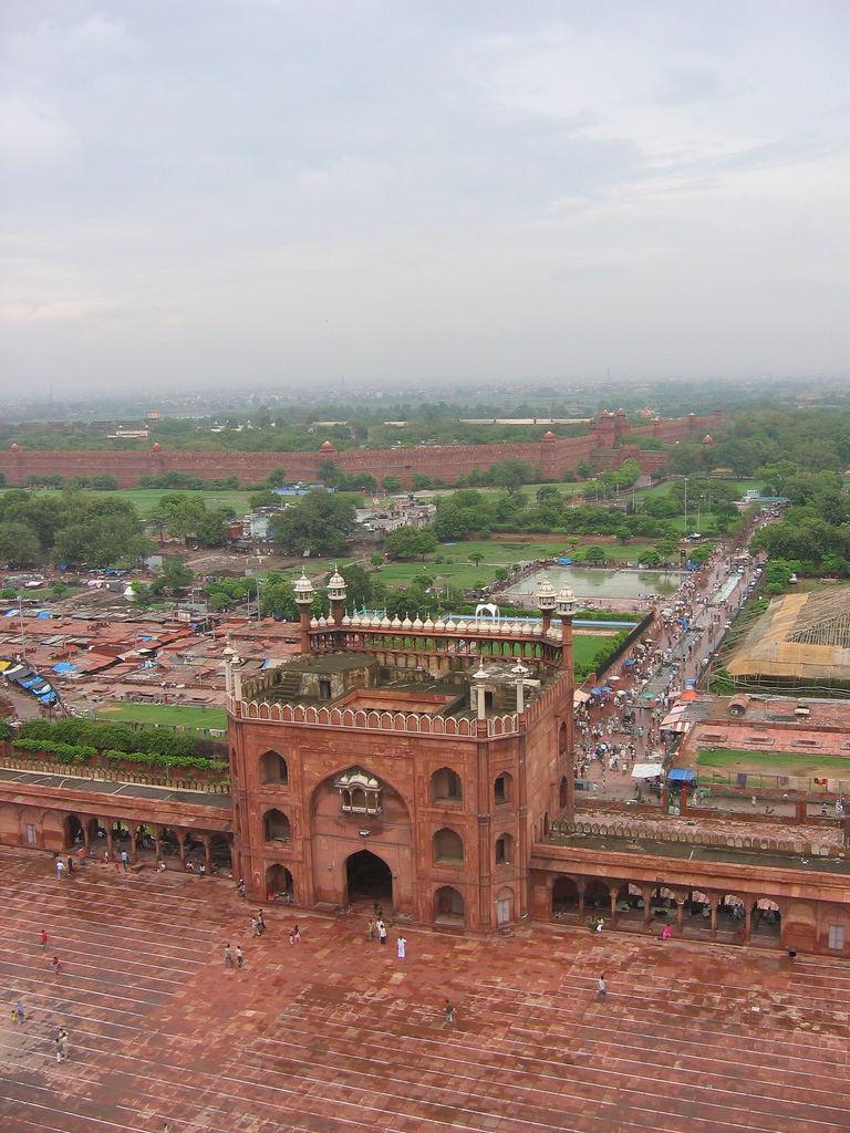 사원 돔에서 바라본 델리의 전경. 자마 마스지드는 역사 전반에 걸쳐 델리의 지속적인 상징으로 여겨져 왔다.