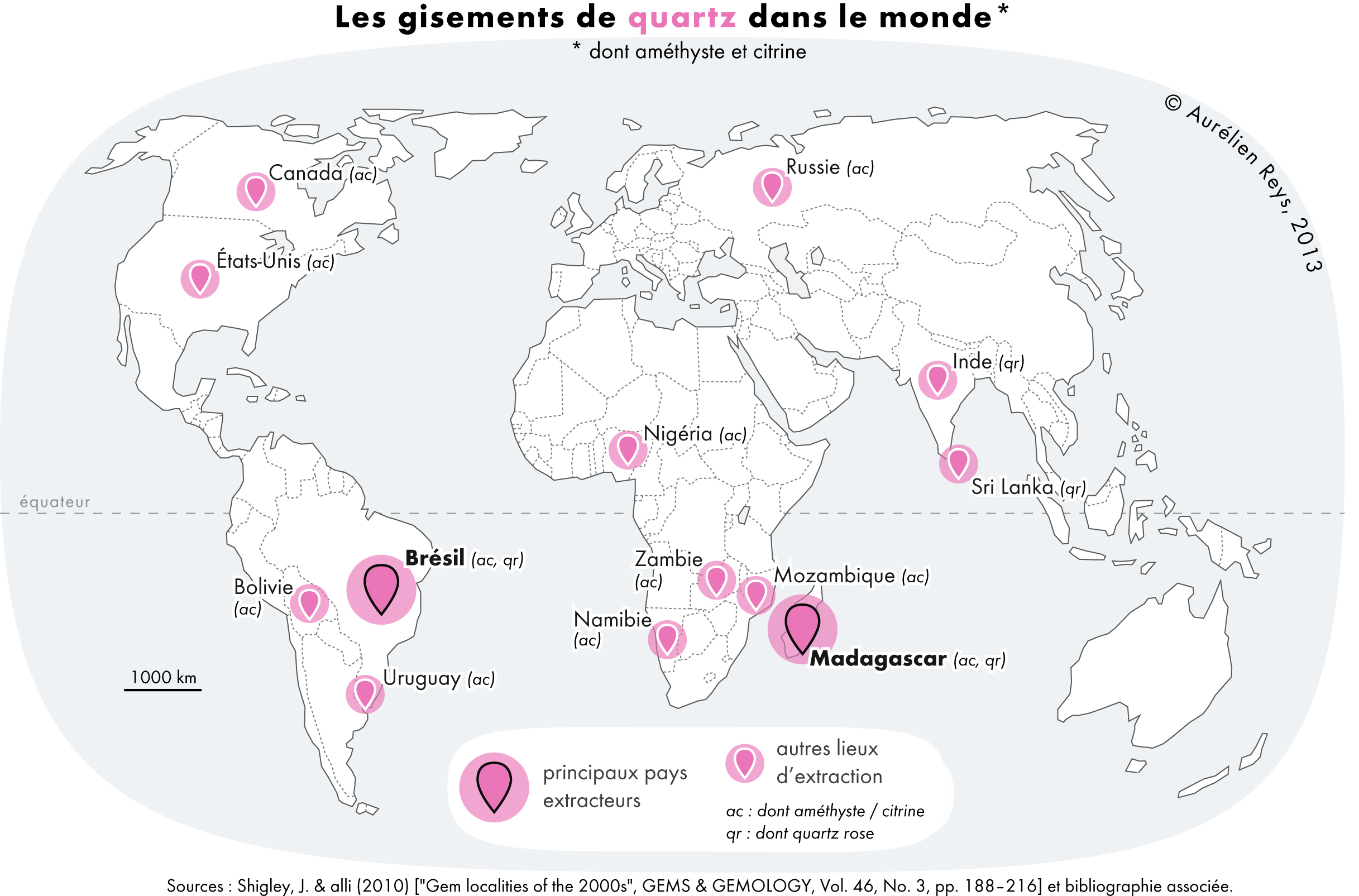 브라질의 리우그란데두술 주는 세계 최대의 자수정 산지이다. 스리랑카, 마다가스카르, 중앙아프리카, 우루과이, 잠비아에서는 질 좋은 자수정이 산출된다.
