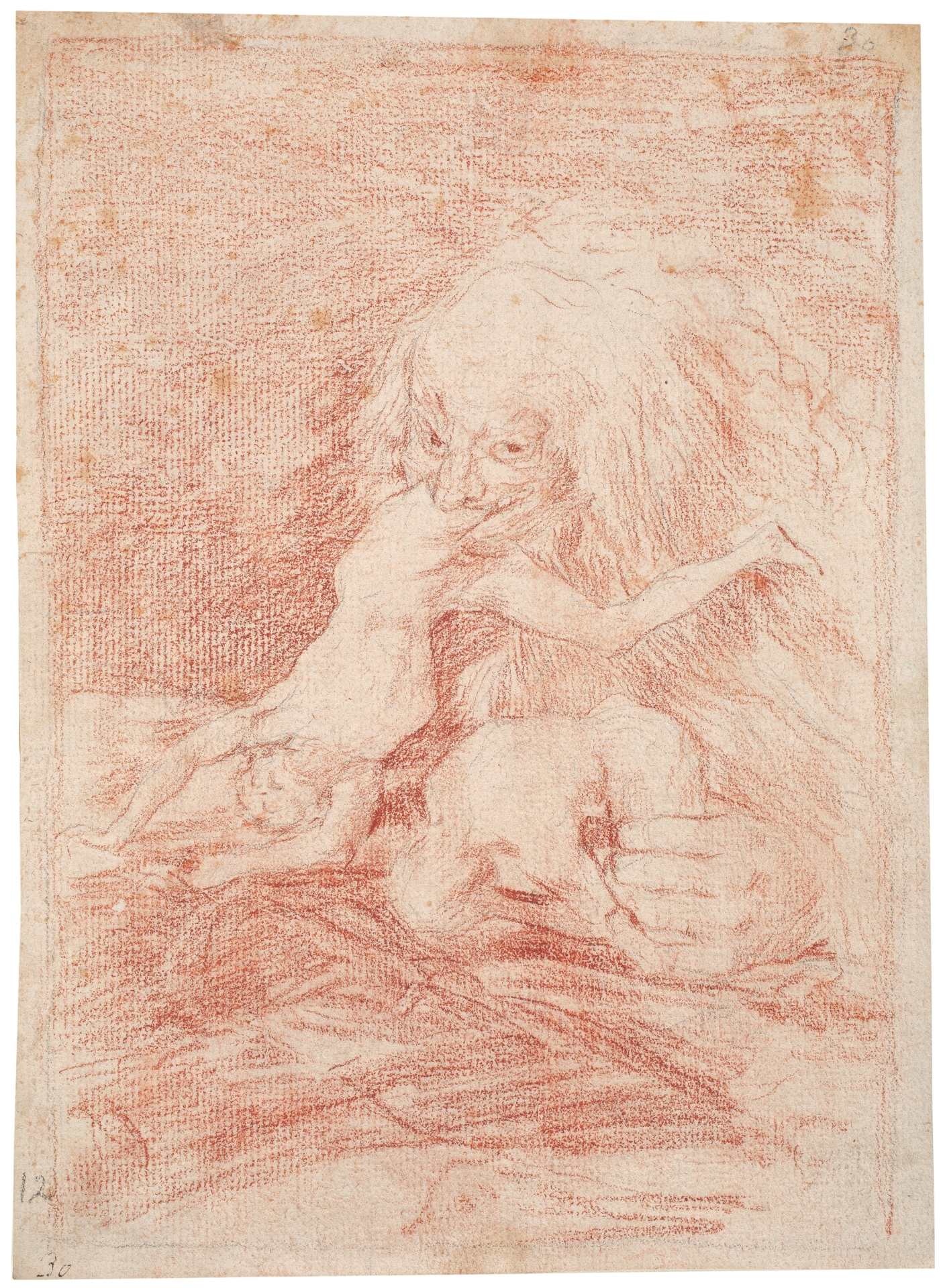 고야는 1796~1797년에 분필로 《자식을 잡아먹는 사투르누스》와 유사한 그림을 그렸는데, 이 그림에서는 한 사람의 다리를 깨물고 다른 사람을 잡아 먹는 모습이 보여지지만, 이후 작품에서 볼 수 있는 잔혹함이나 광기는 전혀 나타나지 않았다.